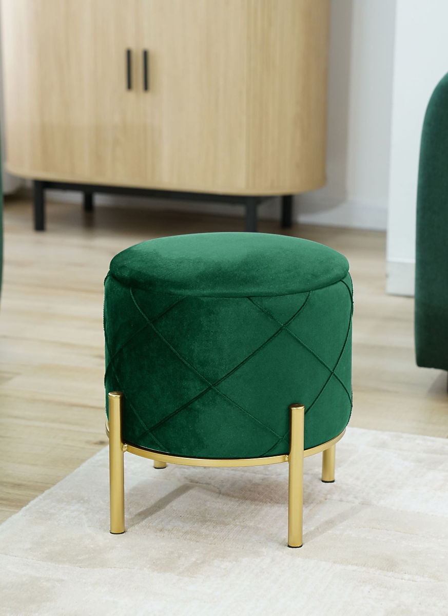 Ein Hocker oder Pouf ist eine hervorragende Ergänzung für das Wohnzimmer oder Schlafzimmer. Dank ihm können müde Füße nach einem ganzen Tag des Gehens entspannen, und wenn der Pouf aus weichem Velours gefertigt ist, verstärkt dies nur das angenehme Gefühl der Entspannung. Das moderne Aussehen wird durch die Metallbeine ergänzt, die in der dieses Jahr so modischen goldenen Farbe lackiert sind. Der aufklappbare Deckel bietet Zugang zum Stauraum, in dem Gegenstände aufbewahrt werden können, die nicht für den täglichen Gebrauch benötigt werden.Spezifikationen: