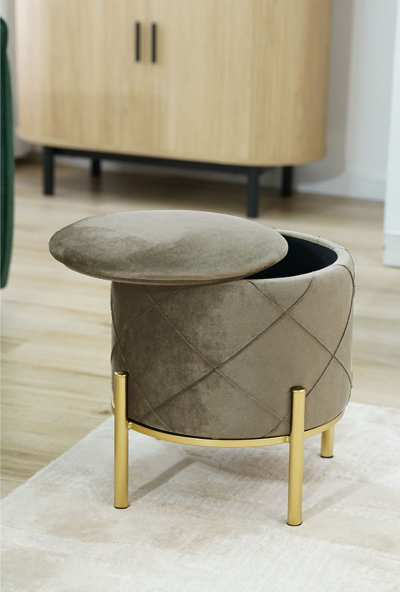Runder Puff mit Stauraum und goldenen Metallbeinen. .. mehr