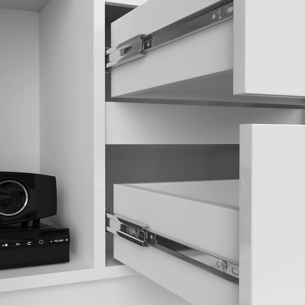 - Die Schubladen bewegen sich auf Metallkugelführungen mit Auszugsperre