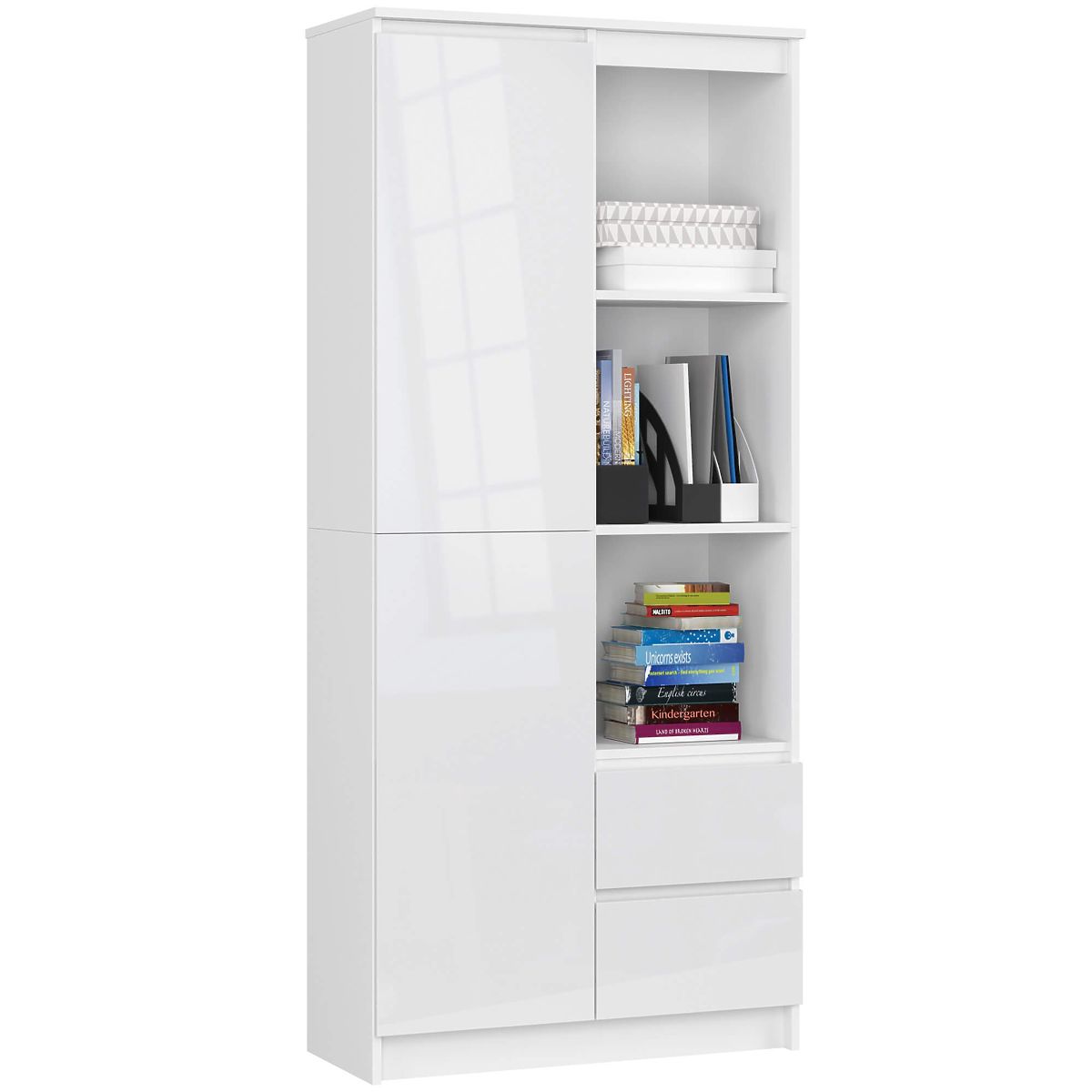 Büroregal mit Türen und Schubladen in Weiß und Frontflächen in Weiß Hochglanz.
