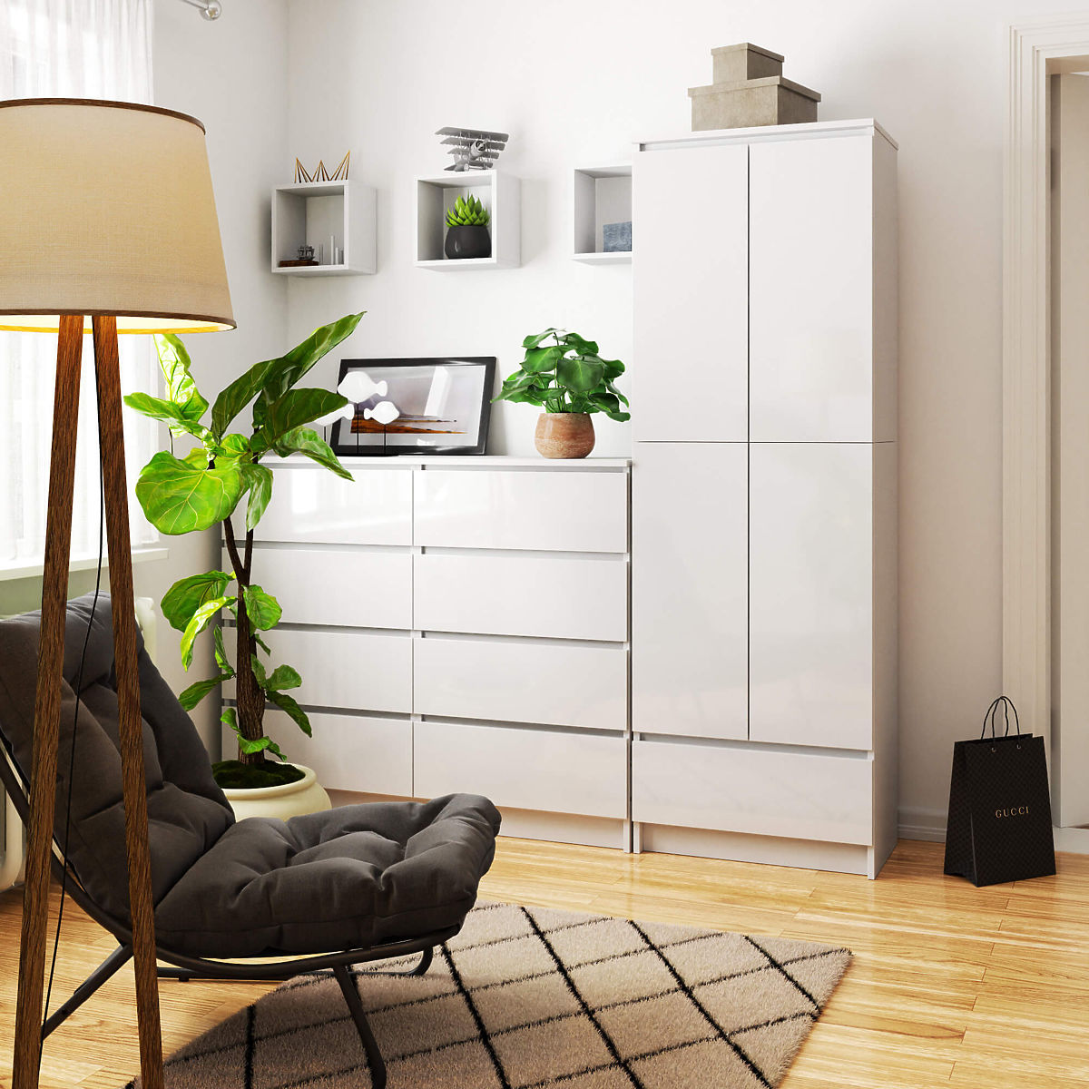 Die weiße Bürobibliothek mit Schublade ist eine perfekte Kombination aus Funktionalität und visueller Anziehungskraft. Das Möbelstück ist praktisch und leicht sauber zu halten und gleichzeitig sehr effektvoll. Im geschlossenen Teil befinden sich geräumige Regale, während im unteren Teil eine geräumige und leicht ausziehbare Schublade ist. Die Nutzung der Bibliothek ist sehr vielseitig und hängt von den individuellen Bedürfnissen ab. Im Schrank können Bücher, Ordner mit Dokumenten und Büromaterialien aufbewahrt werden, ebenso kann sie für Tischgeschirr, Tischdecken oder Handtücher verwendet werden. Die Farbe des klassischen Weiß und die einfache Form der Bibliothek sorgen dafür, dass das Möbelstück in jedes Interieur passt, unabhängig von der Wandfarbe oder dem Stil, in dem es eingerichtet ist. Das Möbelstück ist aus einem strapazierfähigen Material gefertigt, nämlich aus verschleiß- und beschädigungsresistentem Laminat. Die Kanten des Schranks sind mit einer langlebigen und ästhetischen ABS-Kante versehen. Die Fronten der Bibliothek sind hochglanzlackiert, was dem Möbelstück zusätzliche Eleganz verleiht. Die oberen und unteren Türen sind zu einer Einheit verbunden und werden nicht separat geöffnet.