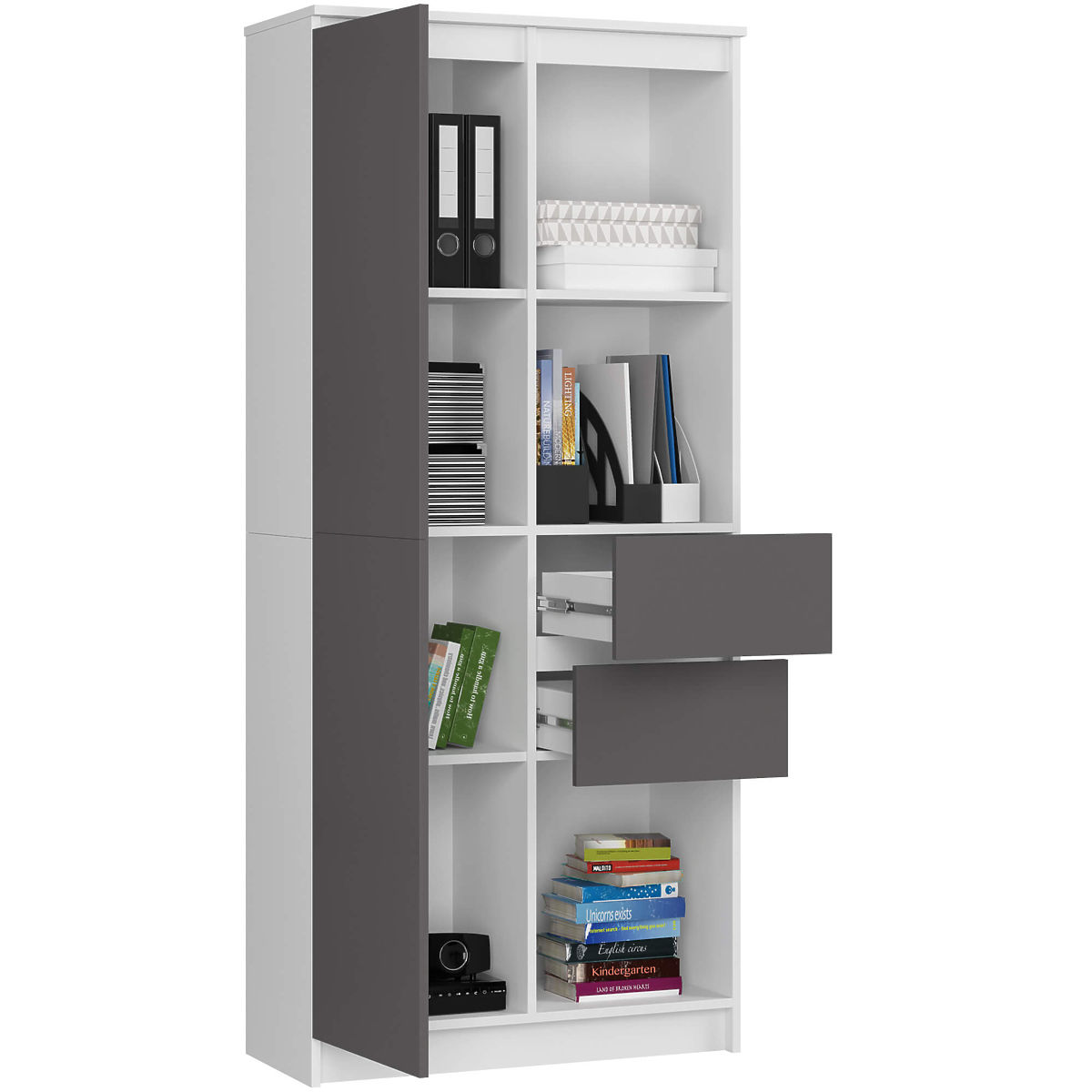 Weißes Büroregal mit graphitgrauen Fronten und 7 Regalböden. .. mehr
