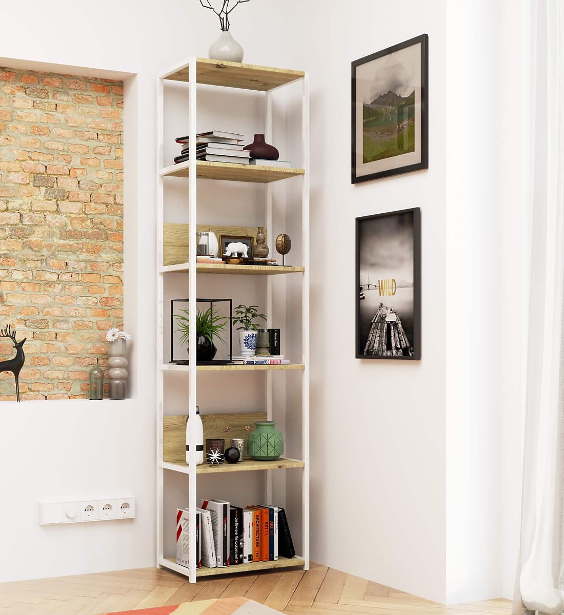 Das Metall-Loftregal ist ein praktisches und modernes Möbelstück, das sowohl ins Wohnzimmer als auch ins Büro passt. Regal mit weißem Metallrahmen und 6 Regalböden in der Farbe Eiche Artisan. Die Regalböden sind aus 16 mm starkem laminiertem Plattenmaterial gefertigt. Es ist ein langlebiges und widerstandsfähiges Material, das sich durch hohe Abriebfestigkeit auszeichnet. Die Kanten sind zusätzlich mit einer ABS-Kante geschützt, wodurch das Möbelstück auch bei sehr intensiver täglicher Nutzung gut aussieht. Das Regal ist mit 6 Regalböden ausgestattet, auf denen Gegenstände platziert werden können, die wir ausstellen oder einfach zur Hand haben möchten. Insgesamt wirkt es sehr stilvoll und modern.