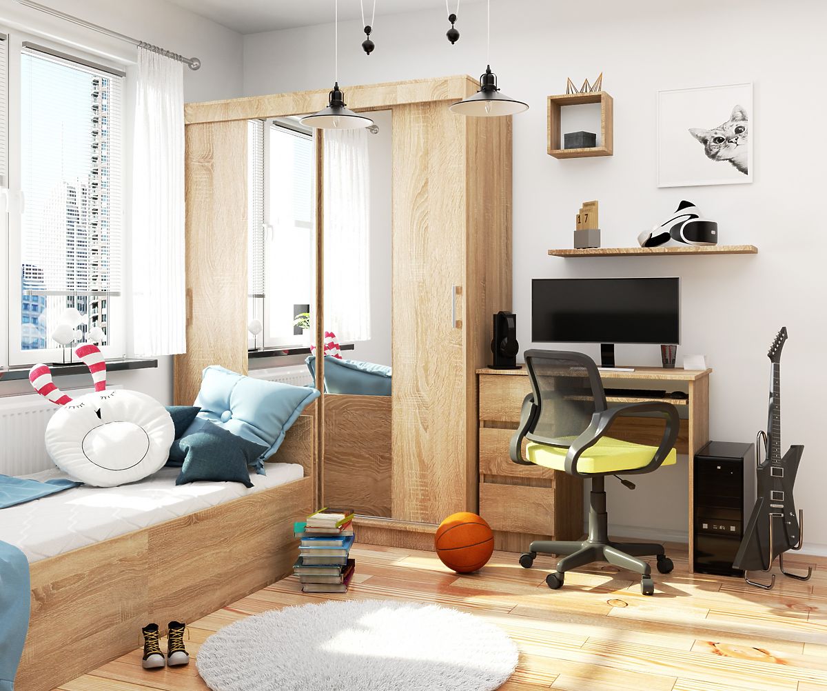 Der geräumige Kleiderschrank in der Farbe Sonoma Eiche mit Schiebetüren und Spiegel ist ein universelles und zeitloses Möbelstück, das seine Funktion in fast jedem Wohnraum erfüllt. Er passt hervorragend in Kinder- und Jugendzimmer sowie in Schlafzimmer oder Ankleidezimmer. In einem entsprechend großen Flur kann er als Schrank für Oberbekleidung und andere notwendige Haushaltsgegenstände dienen.