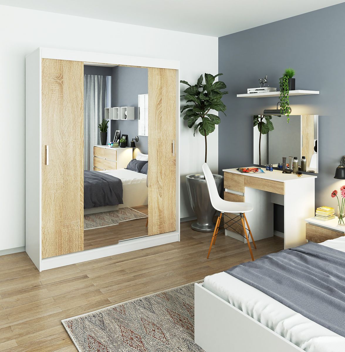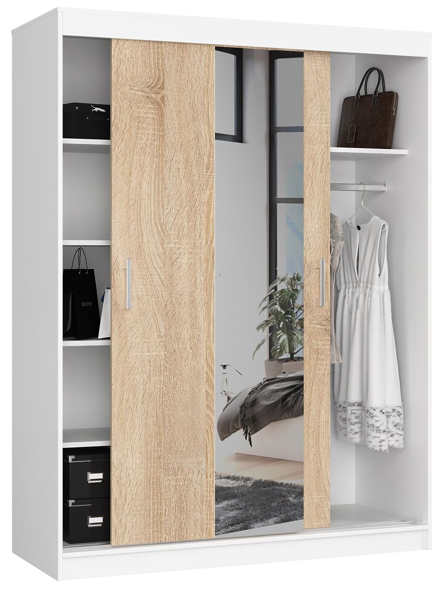 Weißer Schiebeschrank mit Sonoma-Eichen-Dekor, 150 cm, mit Spiegel. .. mehr