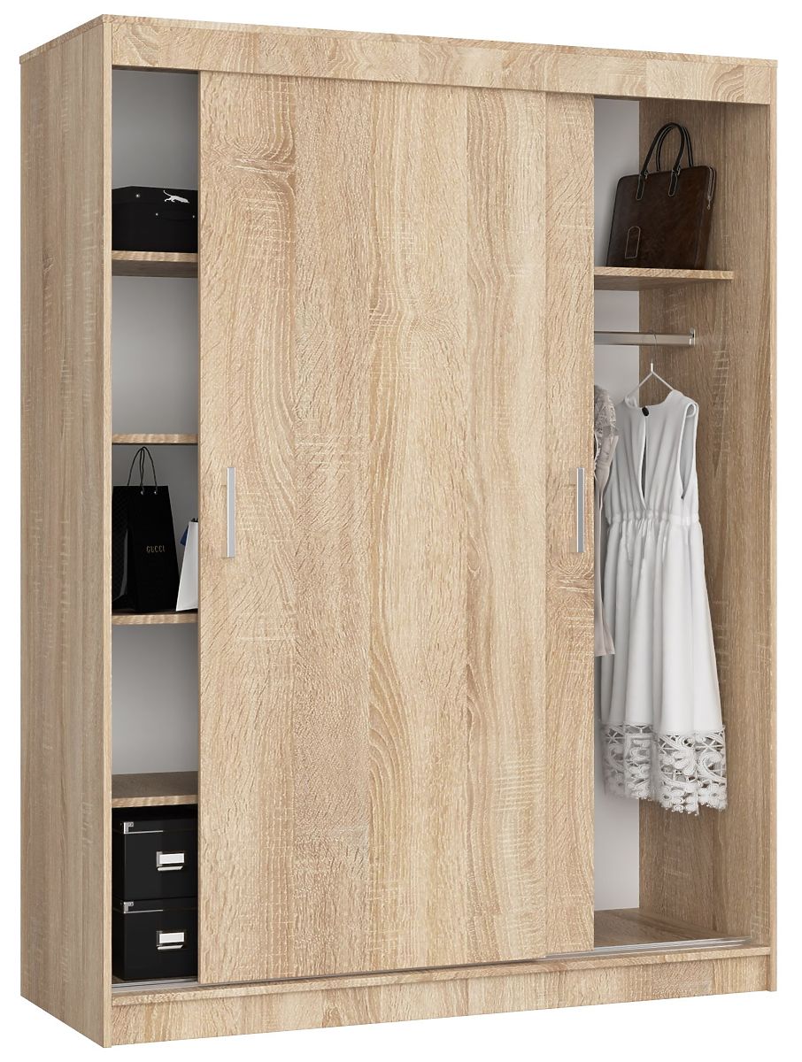 Beim Kauf eines Schranks achten wir darauf, dass er praktisch ist und möglichst viel Kleidung und Accessoires aufnehmen kann. Diese Bedingungen erfüllt unser Schiebetür-Schrank CLP mit einer Höhe von 200 cm und einer Breite von 150 cm! Dank 6 tiefer Regale und einer Stange können Sie problemlos nicht nur gewöhnliche T-Shirts, sondern auch elegante Kleider, Anzüge oder Sakkos verstauen. Was zeichnet unseren Schrank noch aus? Die Ausführung in der Farbe Eiche Sonoma passt ideal in einfache, minimalistische, skandinavische Interieurs. Er wird sicherlich auch gut mit weißen Wänden harmonieren.