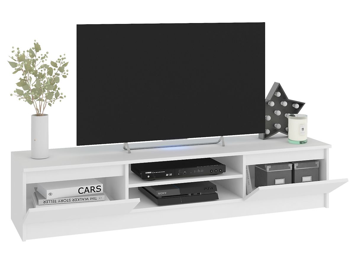 Das Möbelset, bestehend aus einem TV-Schrank und zwei Hängeschränken, kann eine funktionale Ausstattung für das Wohnzimmer, das Arbeitszimmer oder das Studentenzimmer sein. Der TV-Schrank hat eine große Platte, auf die ein Fernseher beliebiger Größe und dekorative Elemente gestellt werden können. Die Möbel sind mit praktischen Regalen für Elektronik und seitlichen Stauräumen mit Klapptüren ausgestattet, in denen DVDs, Computerzubehör oder andere Kleinigkeiten aufbewahrt werden können. Der TV-Schrank in Kombination mit den Hängeschränken an seinen Seiten bildet eine optisch attraktive Komposition. Die Möbel nehmen wenig Platz ein, was sie nicht nur für ein großes Wohnzimmer, sondern auch für kleinere Räume geeignet macht.