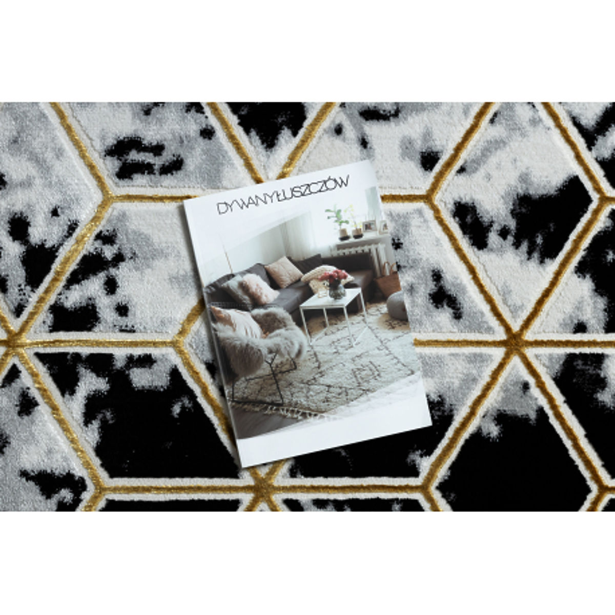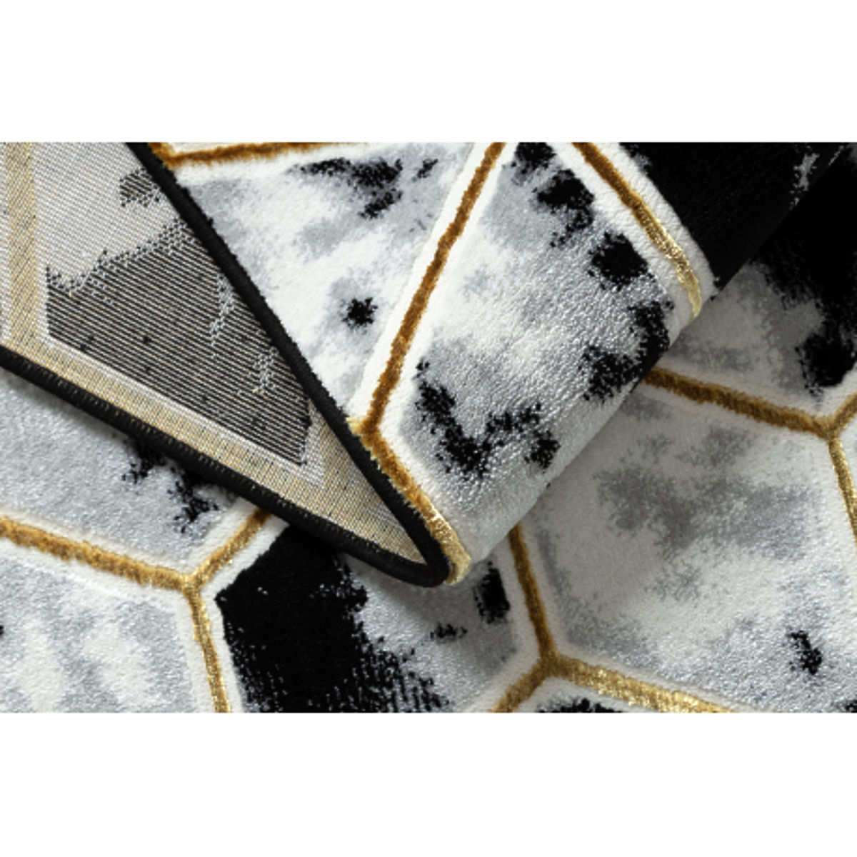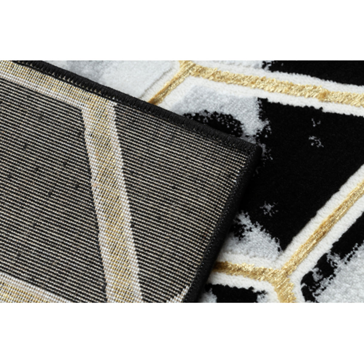 Teppich mit 3D-geometrischem Muster in Schwarz und Gold. .. mehr