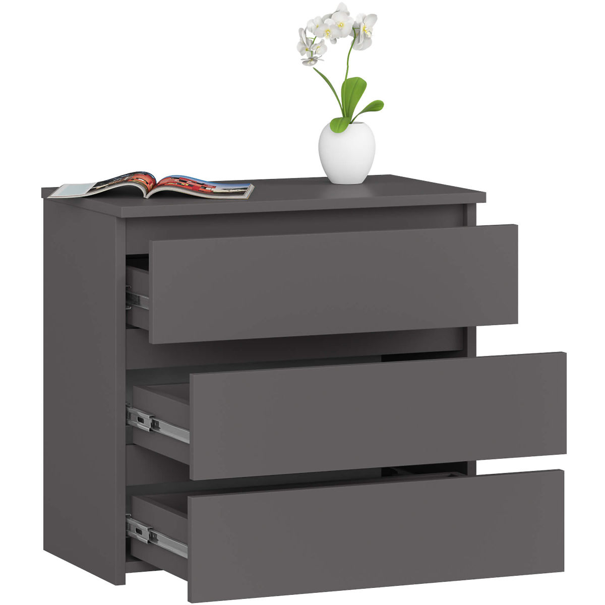 Die Kommode in Graphitgrau verfügt über 3 leicht zu öffnende Schubladen. Sie eignet sich hervorragend als unverzichtbares Element der Schlafzimmerausstattung. In den Schubladen können Wäsche, Kosmetikzubehör oder ein Satz Bettwäsche zum Wechseln aufbewahrt werden. Die Platte ist ideal zum Aufstellen einer Nachttischlampe und zum Ablegen interessanter Lektüre. Das Möbelstück kann auch im Kinderzimmer und im Schlafzimmer eines Teenagers platziert werden.