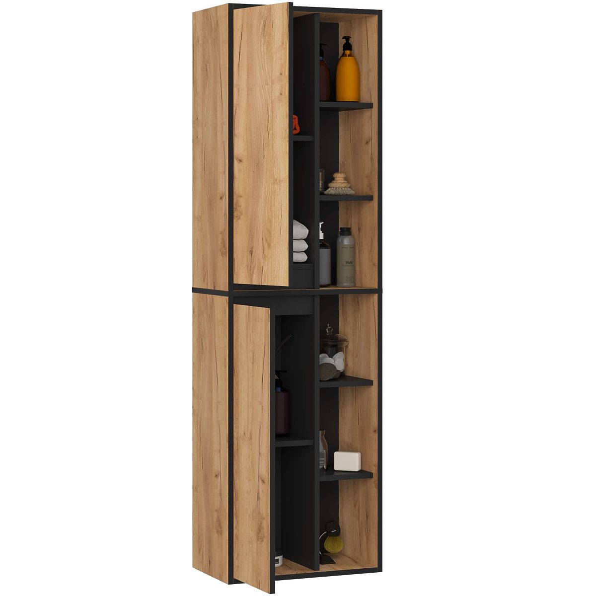 Der hohe Badezimmerschrank VAMI W50 ist zur Wandmontage vorgesehen. Mit diesem Schrank finden alle Kosmetika, Badezimmerzubehör und Handtücher ihren Platz und das Innere wirkt ordentlich. Die durchdachte Konfiguration mit einem geschlossenen und einem offenen Teil ermöglicht die bequeme Aufbewahrung verschiedener Produkte. Der hohe Badezimmerschrank VAMI W50 hat folgende Maße: Breite 50 cm, Höhe 170 cm und Tiefe 30 cm.