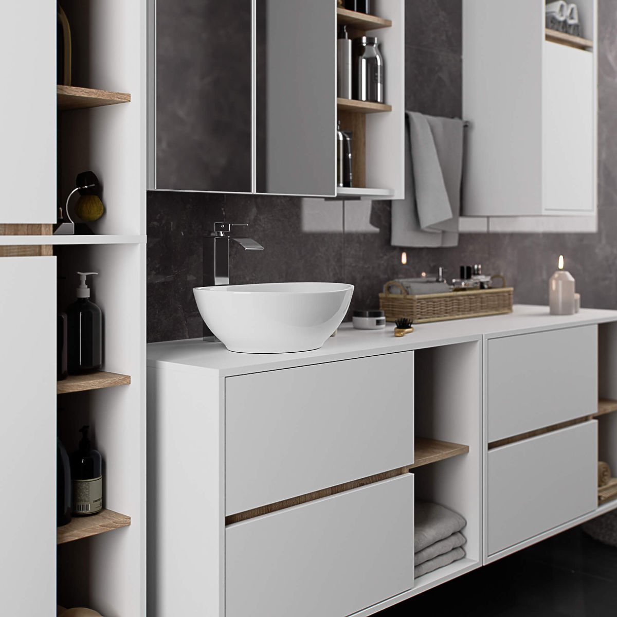 Badezimmerschränke ergänzen hervorragend die Badezimmereinrichtung, bieten den notwendigen Platz für alle Kosmetika und Reinigungsmittel und verleihen dem Badezimmer einen bestimmten Stil. Geräumige Schränke erleichtern die Ordnung im Raum, was sich positiv auf die Ästhetik des Innenraums auswirkt. Die VAMI-Kollektion zeichnet sich durch eine auffällige stilvolle Farbgebung aus – Korpus und Fronten haben die gleiche Farbe, während die Innenfarbe anders ist.
