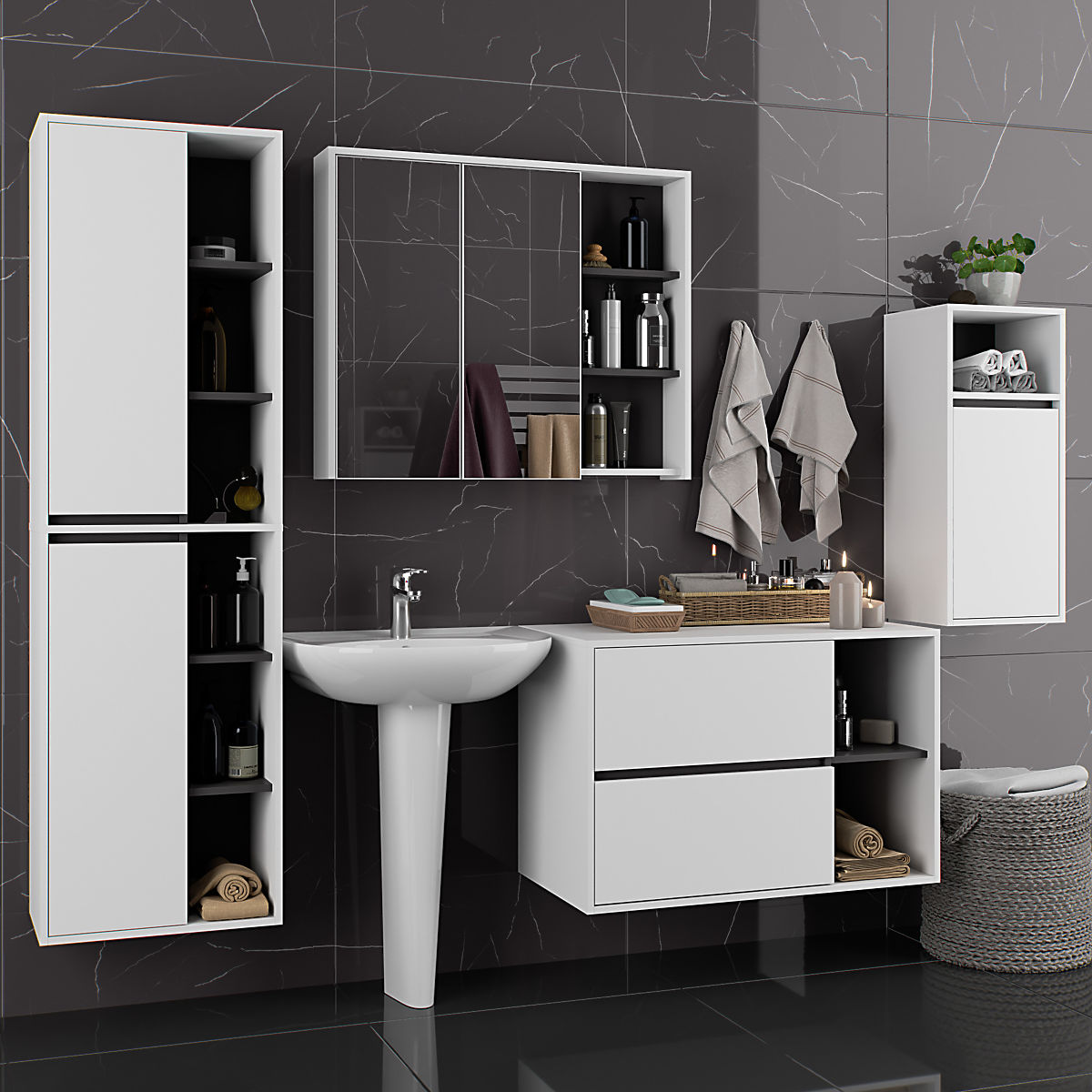 Die Schränke sind unabhängig, was ihre Anordnung in beliebiger Konfiguration und Abständen nach eigenen Bedürfnissen ermöglicht. Der Preis bezieht sich nur auf die Badezimmerschränke, dekorative Elemente sind nicht im Set enthalten.
