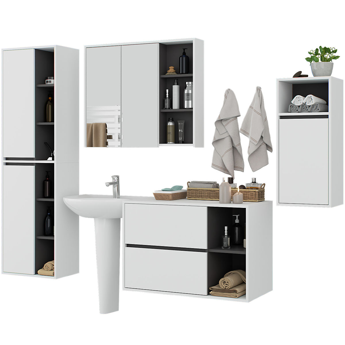 Hängendes Badezimmerset VAMI in Weiß und Graphitgrau. .. mehr