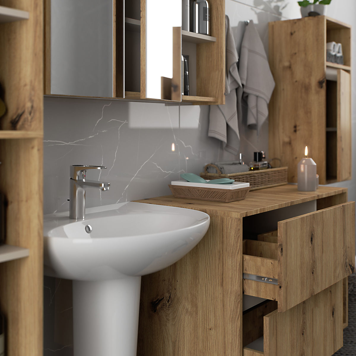 Luka-home.de » Badezimmer und Toilette / Badezimmer-Sets / SET HÄNGENDER BADEZIMMERMÖBEL VAMI EICHE ARTISAN / KASCHMIR