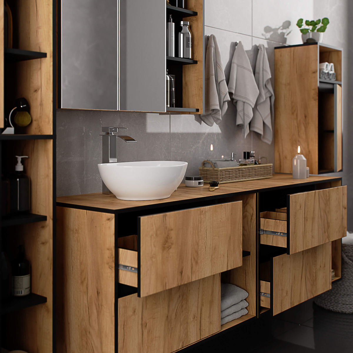 Hängeschrank für das Badezimmer unter dem Waschbecken 90 cm VAMI W90 passt perfekt in ein modernes Interieur. Die Konfiguration mit 2 Schubladen und 2 offenen Regalen bietet großen Komfort bei der Nutzung. In den geräumigen Schubladen können Hygiene- und Kosmetikprodukte aufbewahrt werden, während auf den offenen Regalen beispielsweise Dekorationen platziert werden können, die dem Interieur einen persönlicheren Charakter verleihen. Dieses Modell des Hängeschranks unter dem Waschbecken hat 2 Öffnungen in der Platte, die für die Montage des Waschbeckens und des Siphons vorgesehen sind. Der Schrank verfügt auch über speziell geformte Schubladen, die die Installation von Siphon und hydraulischen Elementen ermöglichen. ACHTUNG! Möbel werden ohne Waschbecken und Armaturen geliefert.