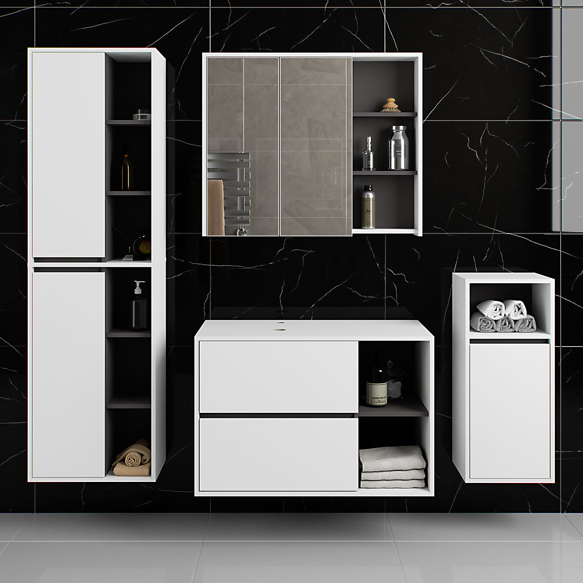 Luka-home.de » Badezimmer und Toilette / Badezimmer-Sets / HÄNGENDE BADEZIMMERMÖBEL-SET MIT ÖFFNUNGEN VAMI WEISS / GRAPHITGRAU