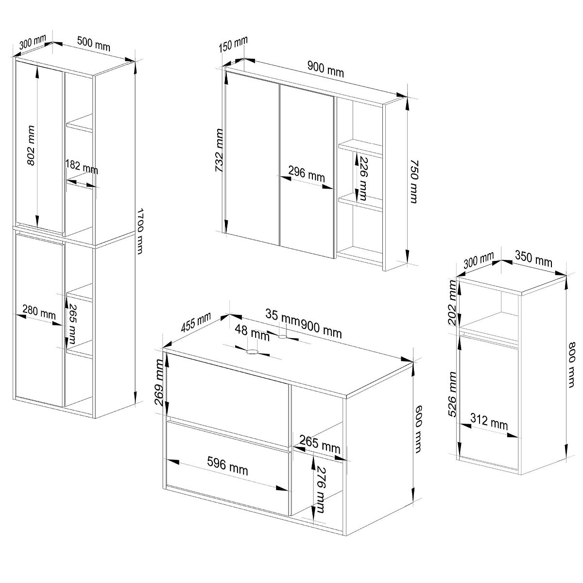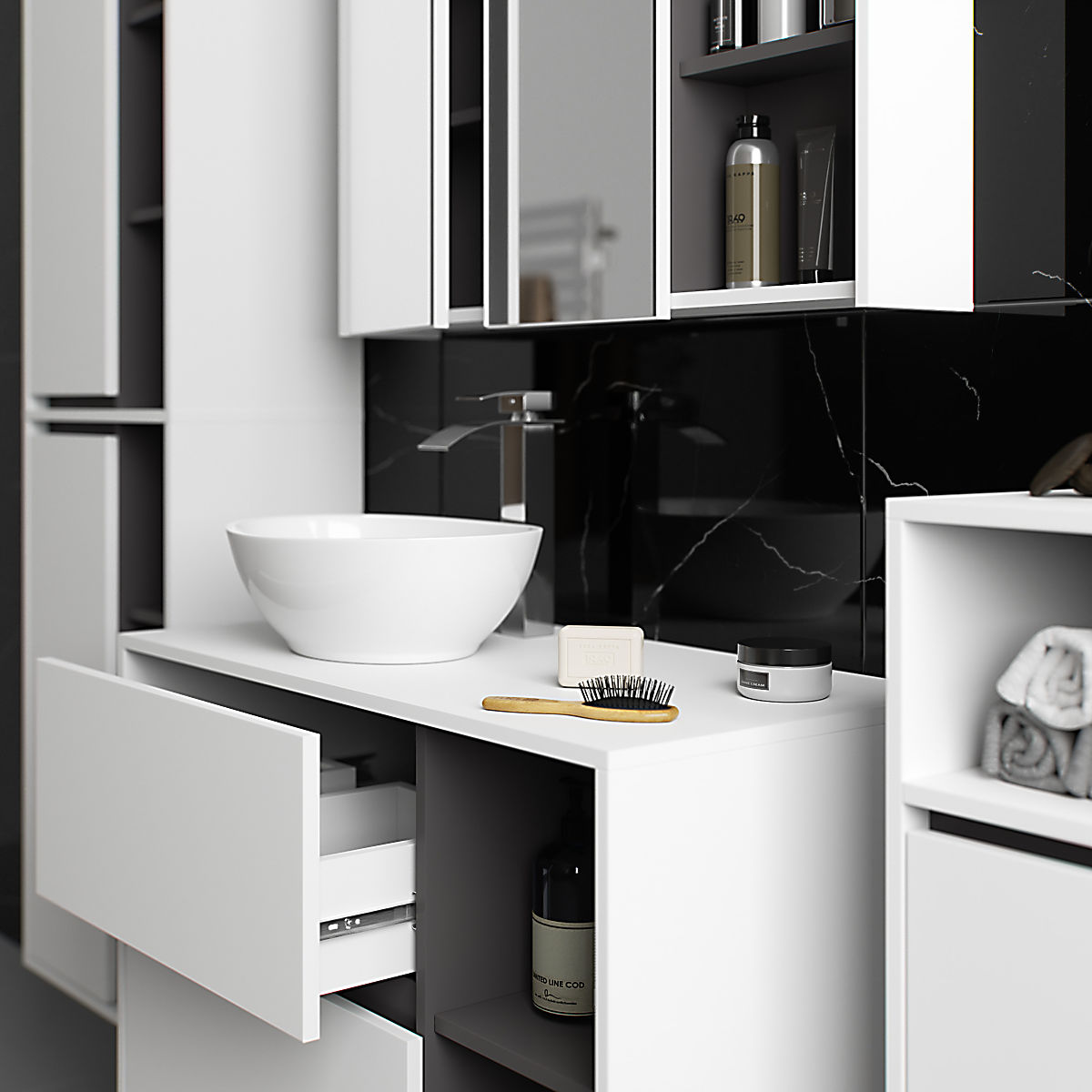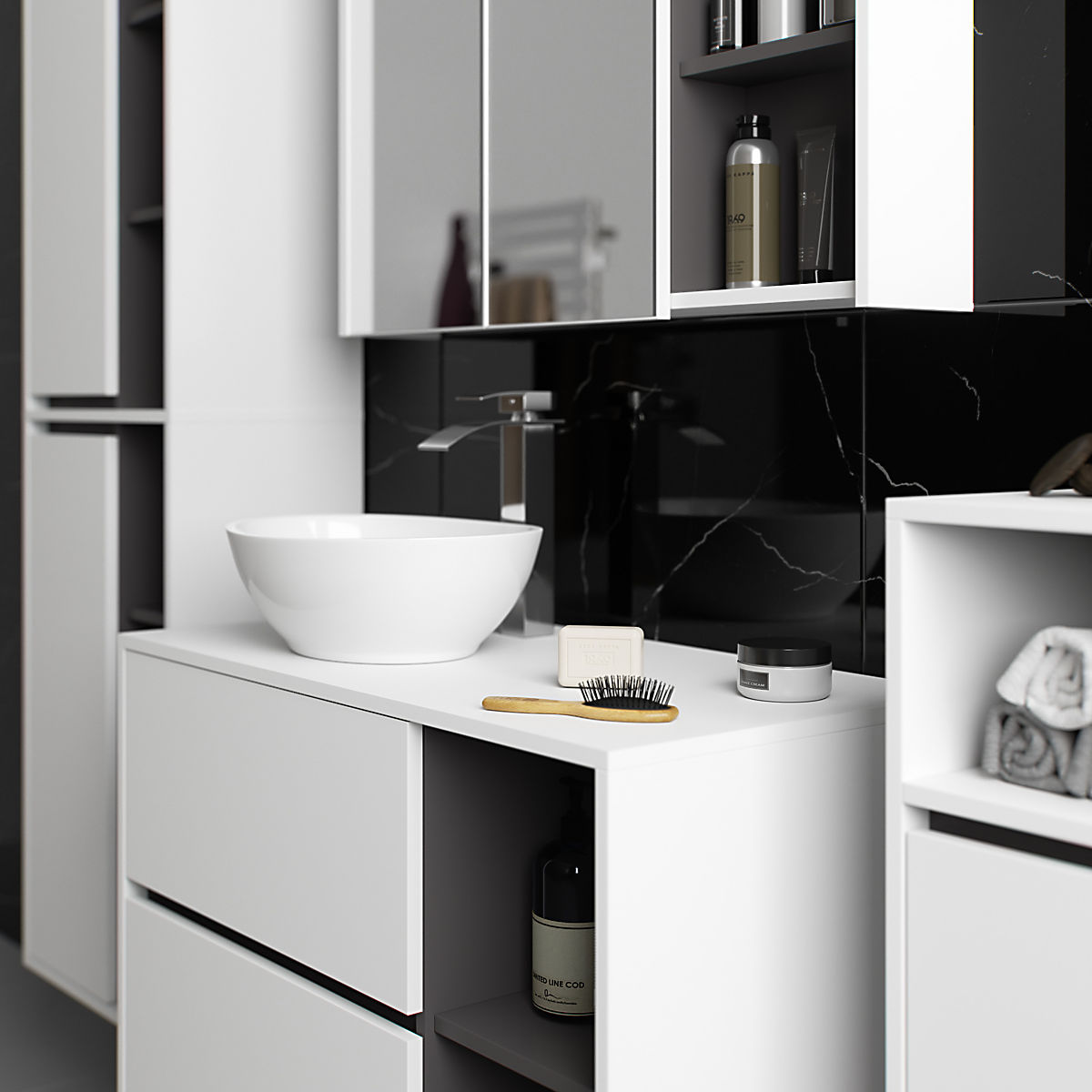 Die Schränke sind unabhängig, was ihre Anordnung in beliebiger Konfiguration und Abständen nach eigenen Bedürfnissen ermöglicht. Der Preis bezieht sich nur auf die Badezimmerschränke, dekorative Elemente sind nicht im Set enthalten.
