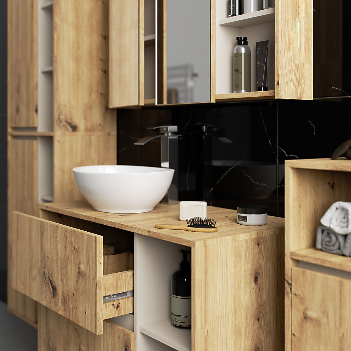 Luka-home.de » Badezimmer und Toilette / Badezimmer-Sets / HÄNGENDE BADEZIMMERMÖBEL-SET MIT ÖFFNUNGEN VAMI EICHE ARTISAN / KASCHMIR