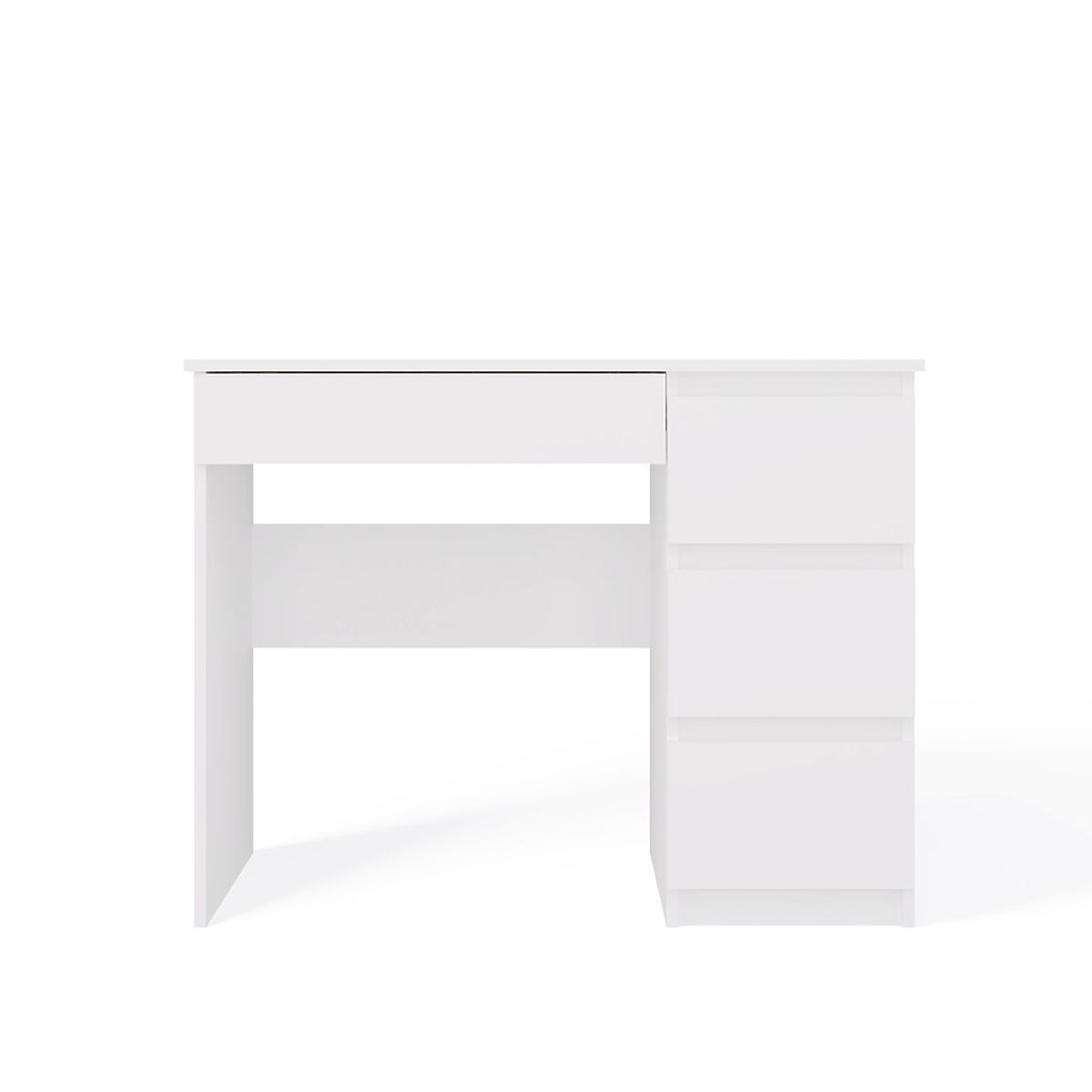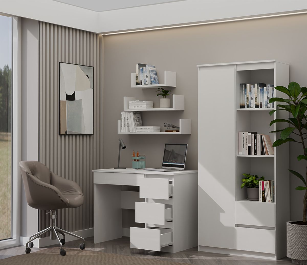 FARBE: WEISS. Das Schreibtischmodell „MIJAS“ eignet sich perfekt für Wohnräume und Büros. Ideal für einen Laptop. Schubladenfronten ohne Griffe. Drei geräumige hohe Schubladen links und eine niedrige rechts. Funktionalität unter der Tischplatte. Schlichtes und modernes Design schafft einen komfortablen Arbeitsplatz. Glatte Seiten ohne Abdeckungen. Einfache Montage. Montageanleitung liegt bei. Tschechischer Hersteller (auf Wunsch kann ich „Polnischer Hersteller“ hinzufügen – bitte geben Sie Ihre Präferenz an). MATERIAL: Korpus und Fronten – 16 mm starke, laminierte Spanplatte.