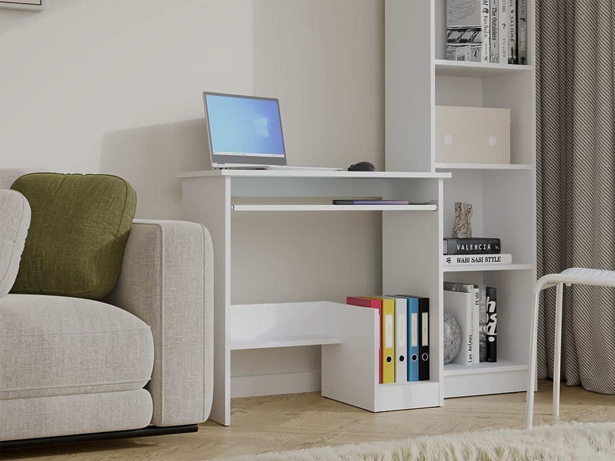 Das Möbelstück ist mit praktischen Lösungen ausgestattet, die den Arbeitskomfort erhöhen: eine bequeme ausziehbare Tastaturablage, Platz für die zentrale Computereinheit oder Ordner und ein weiteres unteres Regal zur Aufbewahrung.