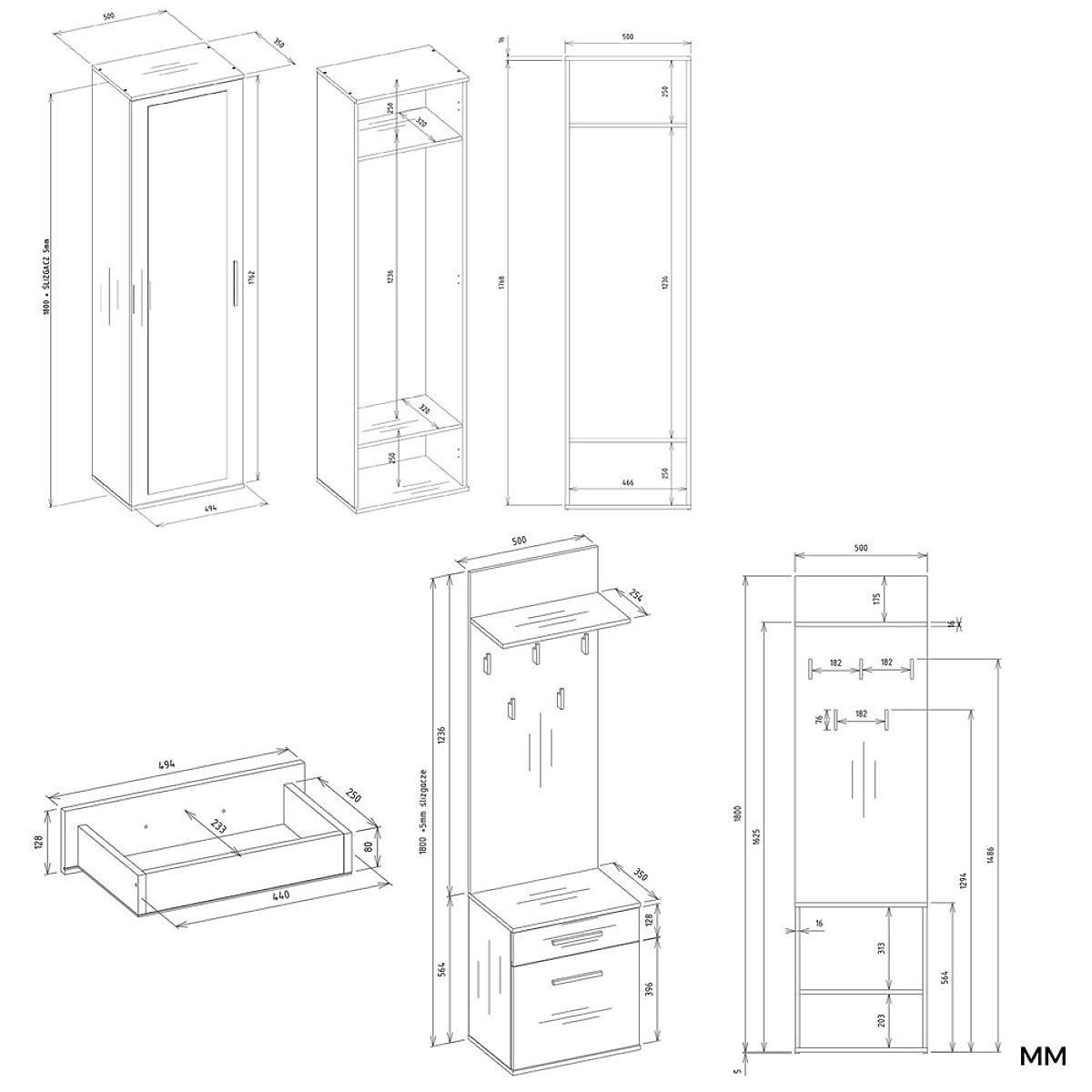 Schrank mit Spiegel, Schränkchen und Garderobe können nah beieinander oder getrennt aufgestellt werden.