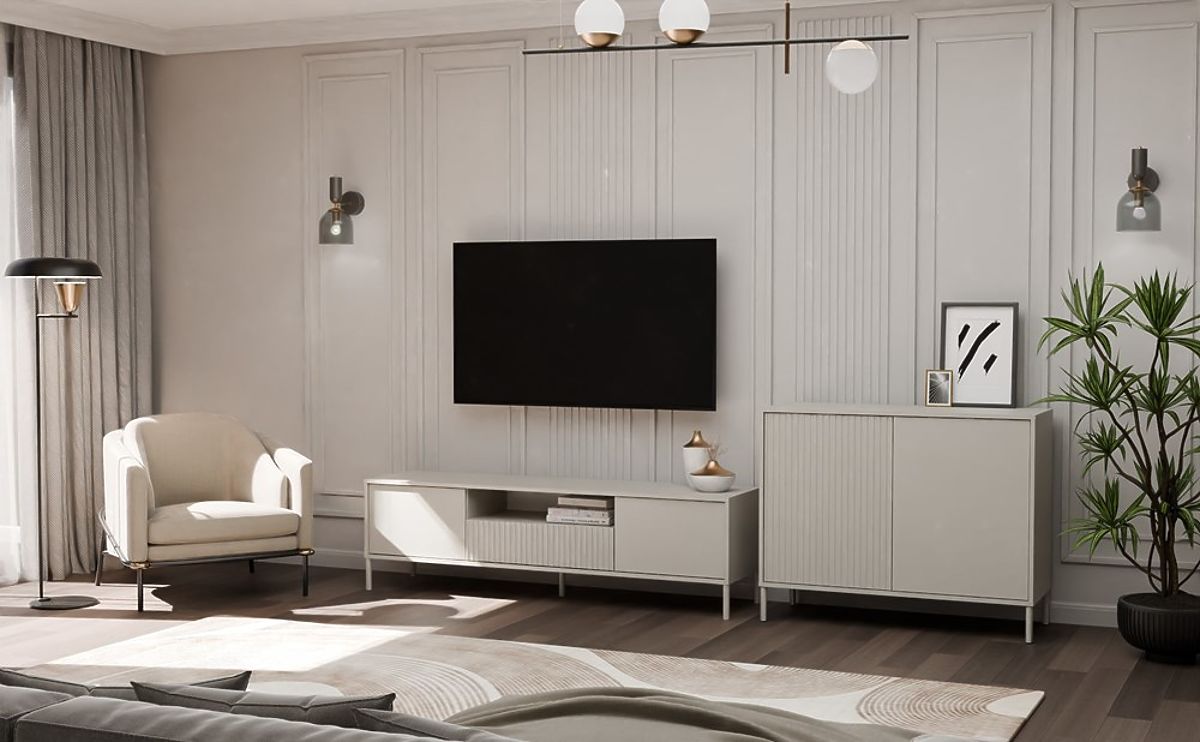 Die Kommode KAMARO 2D SLIM/GLATT KASCHMIR lässt sich hervorragend mit anderen Möbelstücken aus der KAMARO Kollektion kombinieren, wie TV-Schränken, Vitrinen oder weiteren Kommoden. Erstellen Sie harmonische Sets, die auf Ihre Bedürfnisse und Ihren Lebensstil abgestimmt sind!