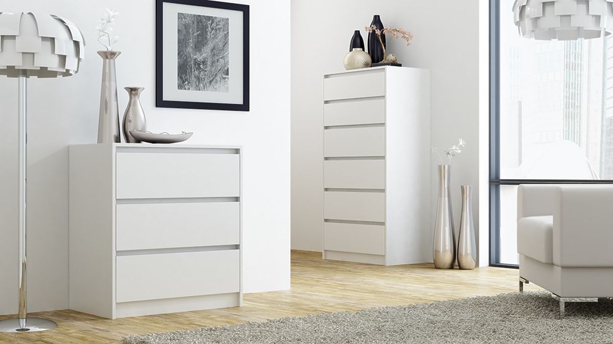 Die moderne Kommode aus der KARO-Kollektion ist ein funktionales und geräumiges Möbelstück, das das Interieur Ihres Schlafzimmers, Wohnzimmers oder Kinderzimmers einrichtet.