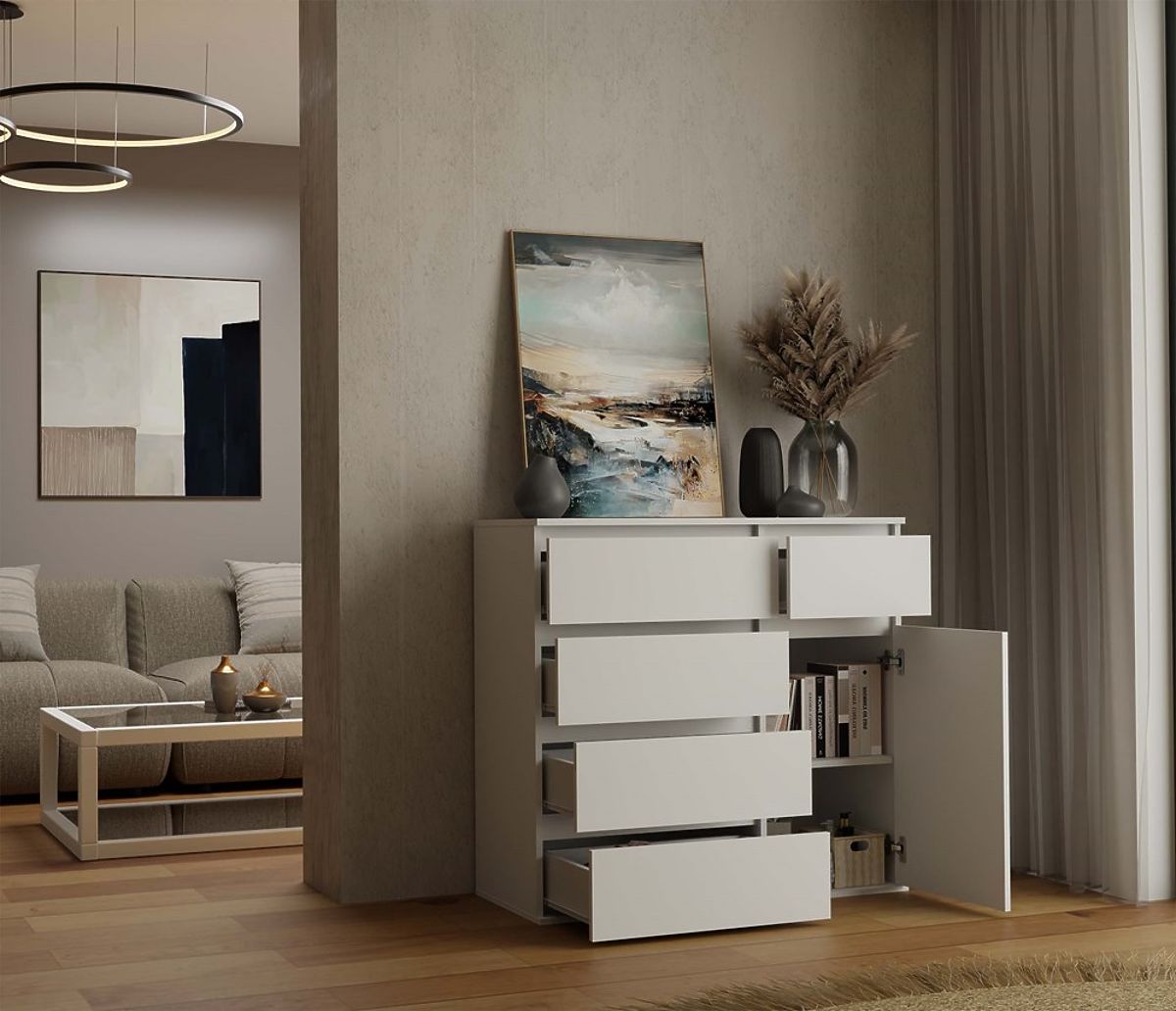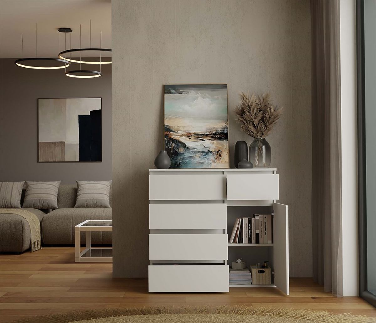 Die durchdachte Anordnung einer Tür und fünf geräumiger Schubladen ermöglicht eine bequeme Aufbewahrung von Kleidung, Dokumenten, Accessoires oder anderen Alltagsgegenständen und hilft, Ordnung im Raum zu halten.
