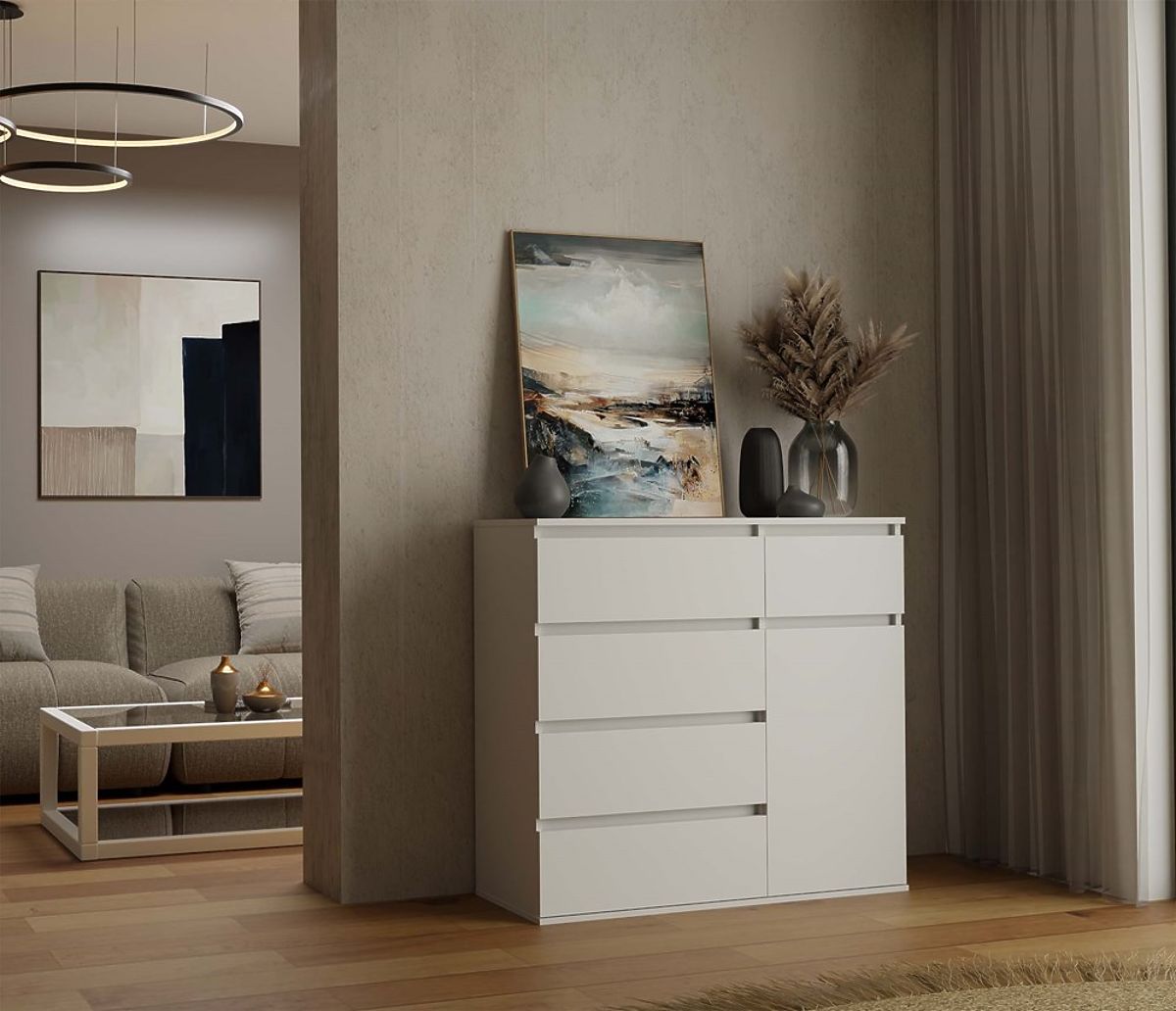 Die Kommode 1D5S in Weiß ist die perfekte Kombination aus Ästhetik und Funktionalität, ideal für moderne und klassische Innenräume.