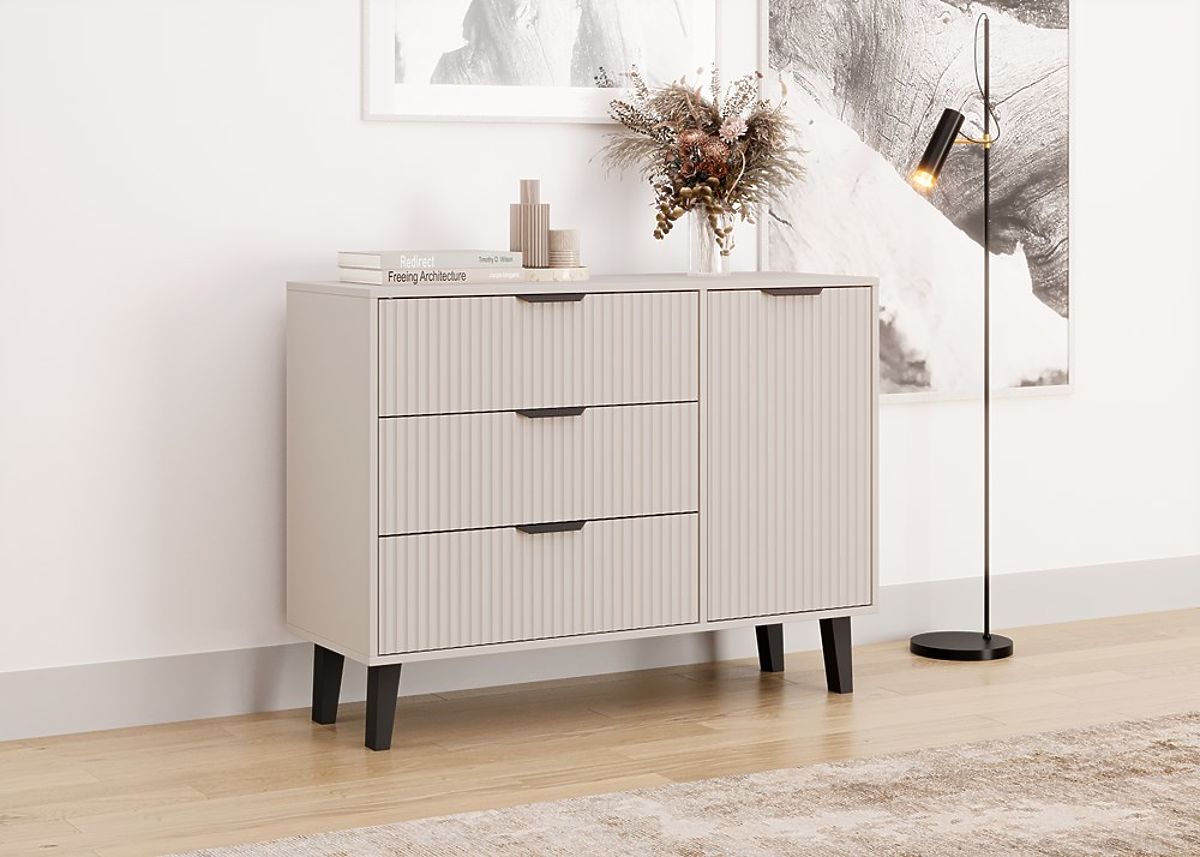 Kommode mit gerillter Front und schwarzen Details. .. mehr