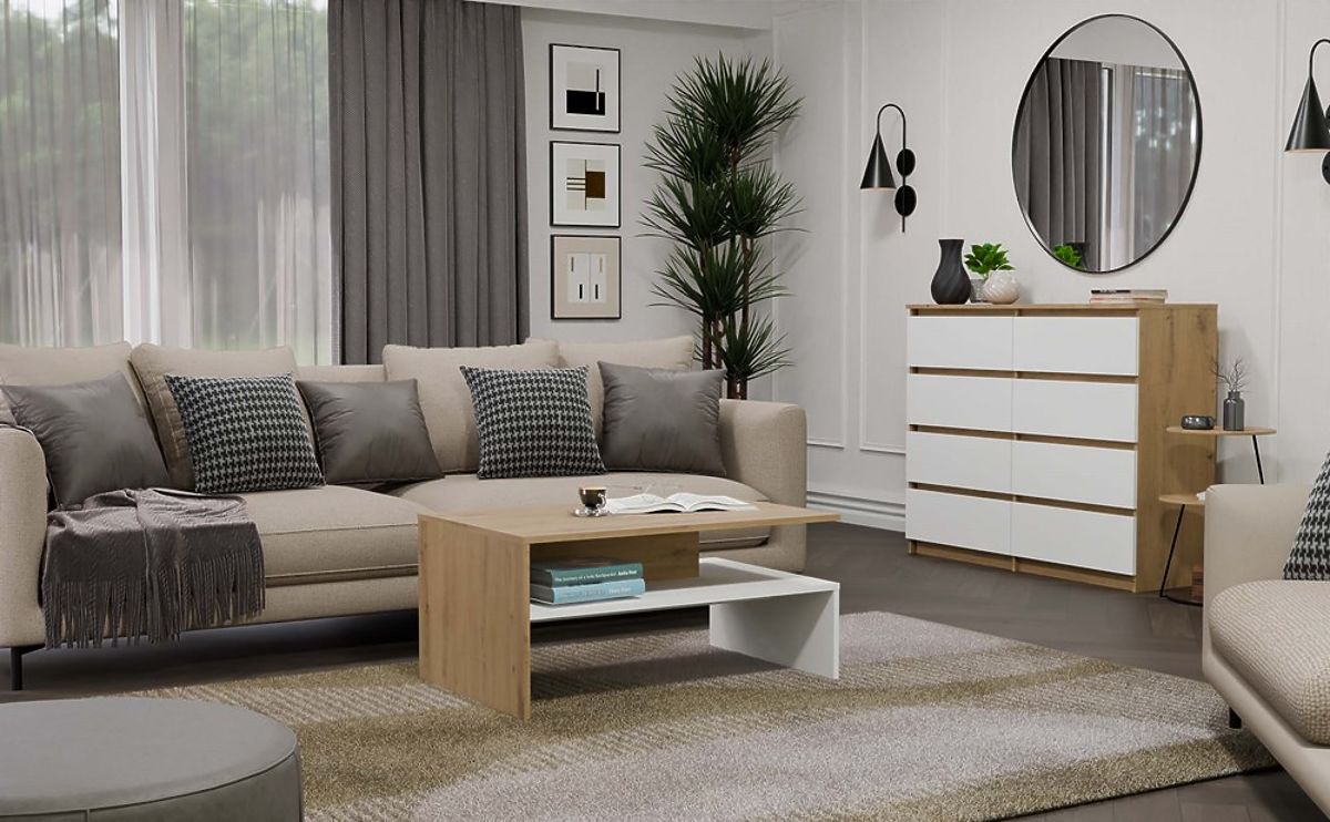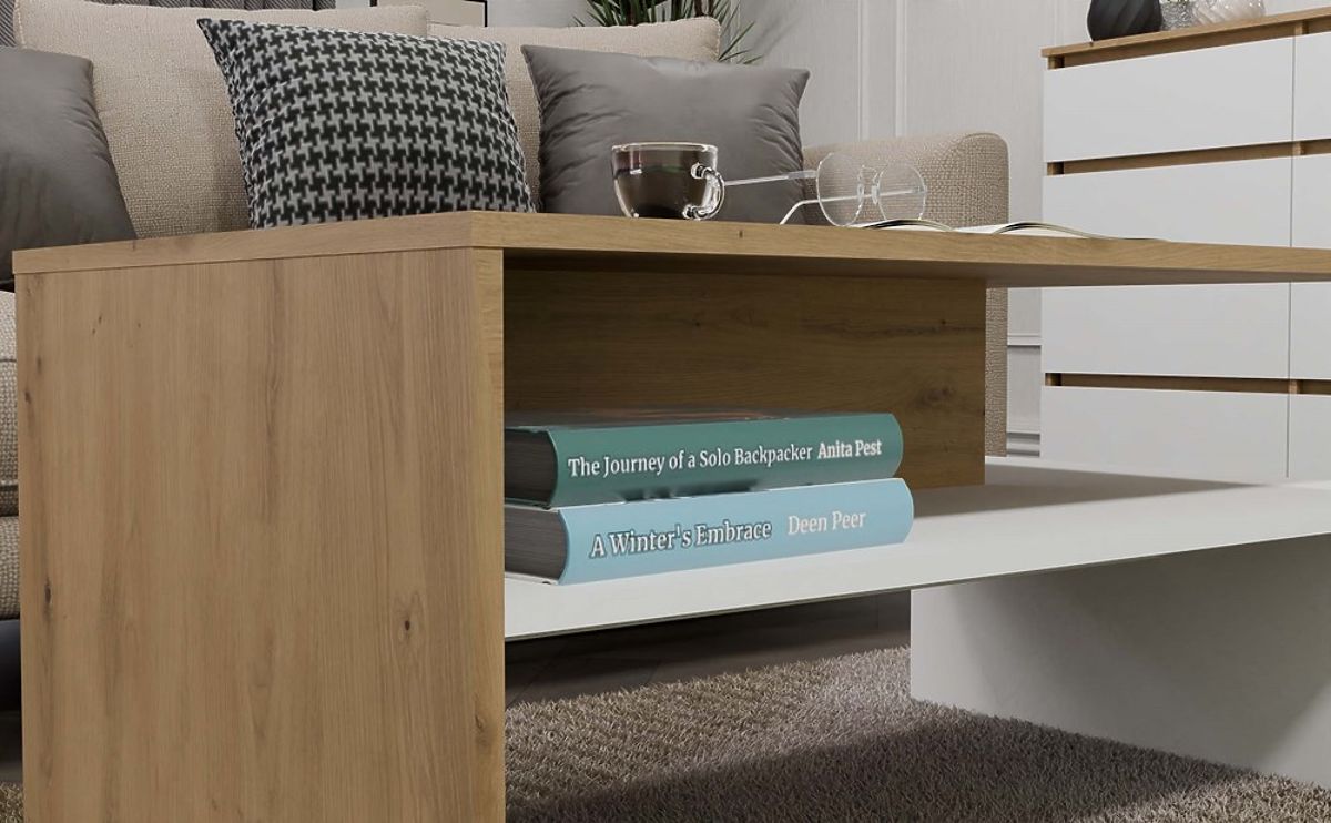 Moderner Couchtisch aus Eiche Artisan und Weiß. .. mehr