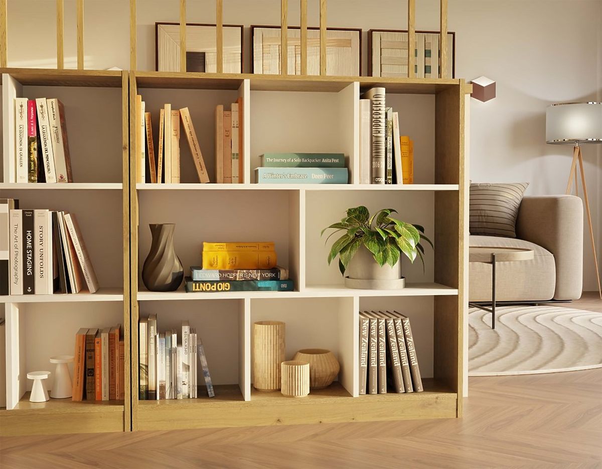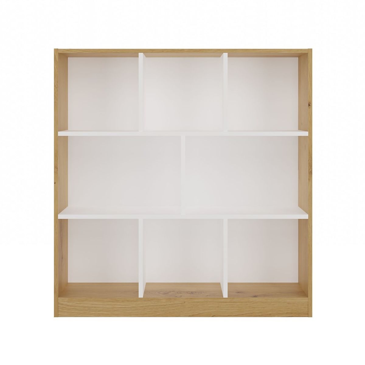 Es verfügt über 8 geräumige Fächer, die bei der Organisation des Raumes helfen und eine ästhetische Präsentation Ihrer Lieblingsgegenstände ermöglichen. Die Kombination aus dem warmen Farbton der Eiche Artisan und den kontrastierenden weißen Regalböden verleiht dem Möbelstück einen modernen und eleganten Charakter.