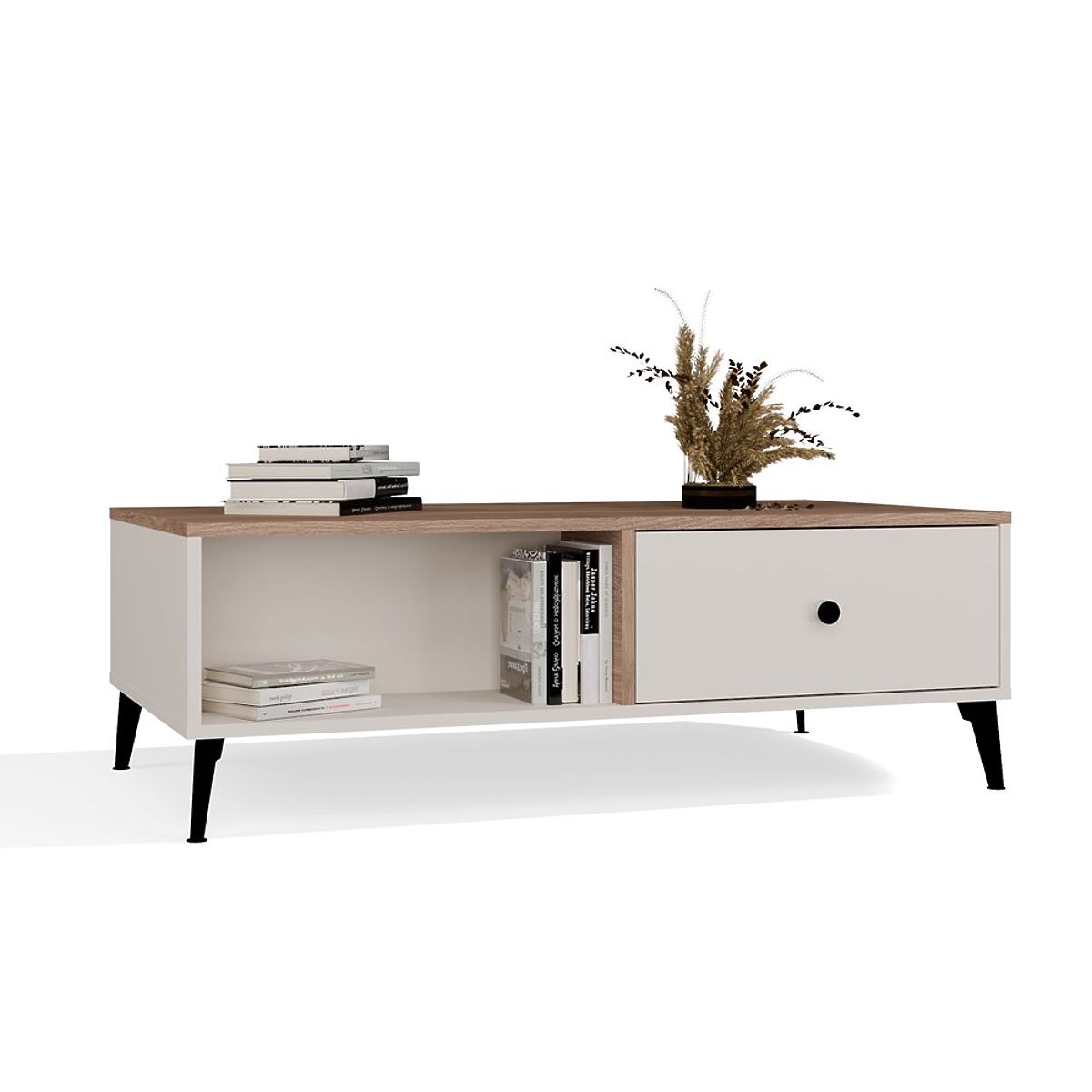 Der schwarze Detail in Form von Griffen und hohen, metallischen Beinen verleiht dem Möbelstück Leichtigkeit und Charakter. Auf beiden Seiten des Tisches befinden sich praktische Schubladen mit sanftem Schließen – ideal für kleine Alltagsgegenstände. Die zentralen offenen Regalböden bieten Platz für Zeitschriften, Fernbedienungen oder Bücher.