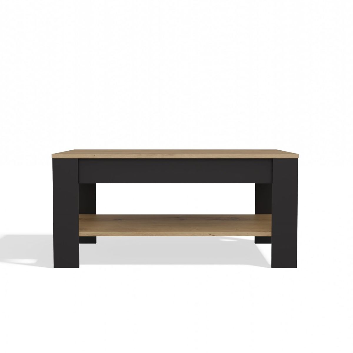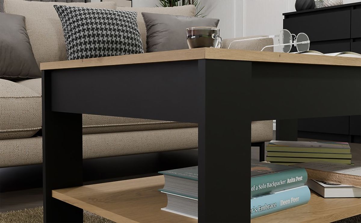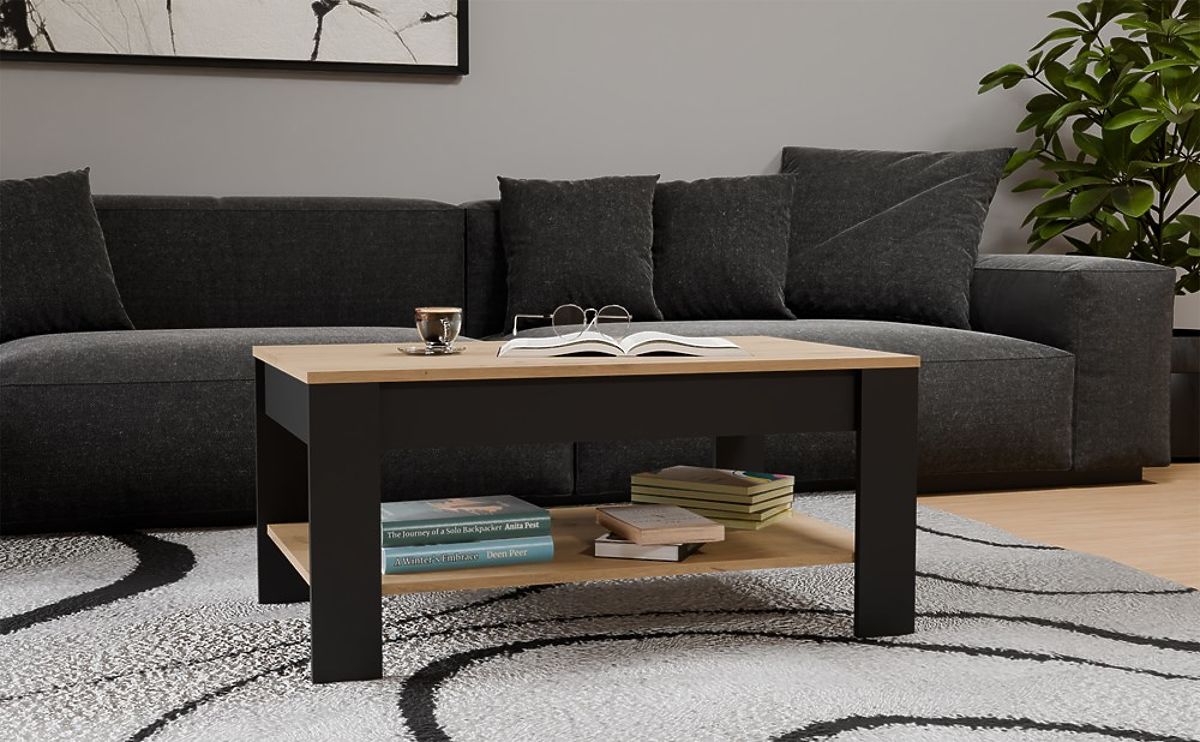 Der moderne Couchtisch OHIO ist die perfekte Ergänzung für das Wohnzimmer, den Aufenthaltsraum oder die Entspannungsecke. Die Kombination aus Eiche Artisan Dekor und mattem Schwarz verleiht dem Möbelstück einen modernen und eleganten Charakter. Die minimalistische Form und das funktionale untere Regal sorgen dafür, dass das Möbelstück nicht nur ästhetisch, sondern auch sehr praktisch für den täglichen Gebrauch ist.