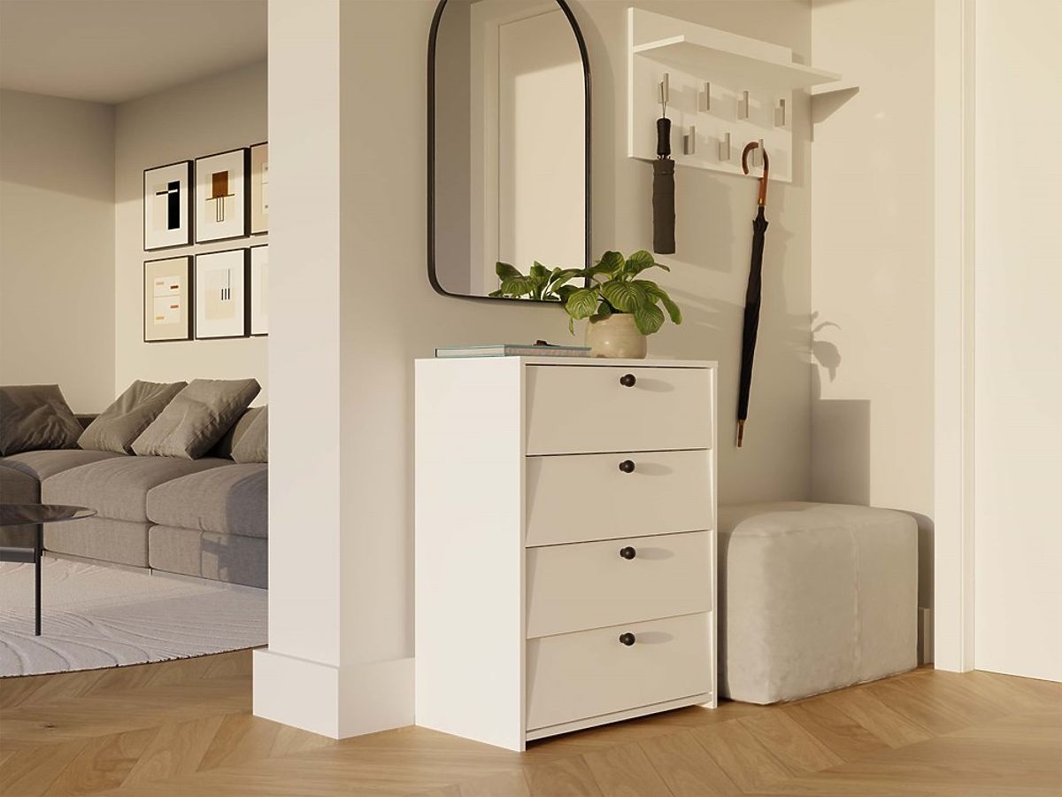 Der funktionale Schuhschrank LOKA ist die ideale Lösung für den Flur, die Diele oder das Ankleidezimmer. Dank vier separater Klappen mit bequemen Griffen bietet er Platz für viele Schuhpaare und sorgt gleichzeitig für Ordnung und Ästhetik im Raum. Es ist ein praktisches und kompaktes Möbelstück, das den verfügbaren Raum optimal nutzt - auch in kleinen Innenräumen.