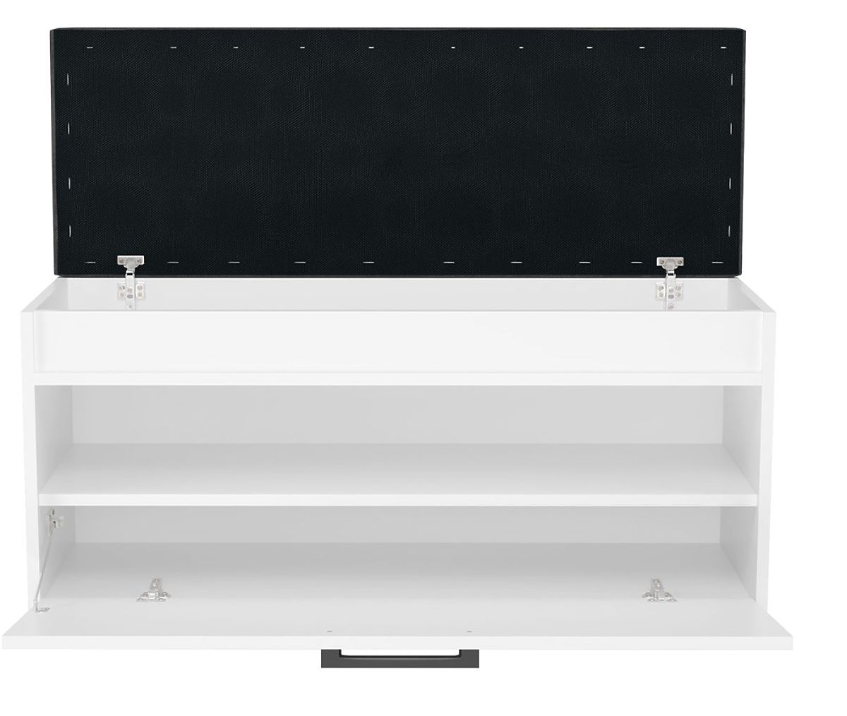 Der Schuhschrank hat Klapptüren, hinter denen sich ein Regal befindet.