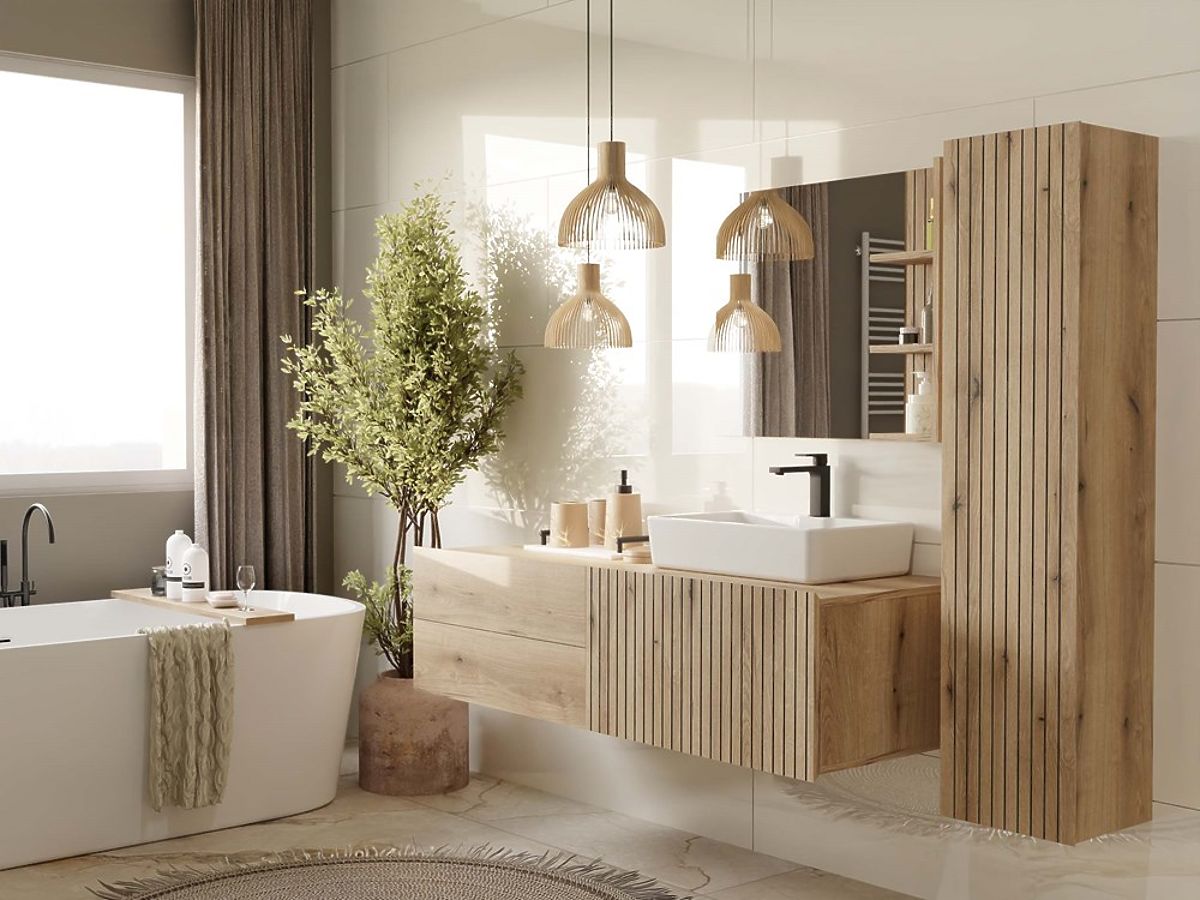 TIGO 1D2S ist ein eleganter und funktionaler Badezimmerschrank, der mit modernem Design und perfekter Verarbeitung begeistert. Das charakteristische Frontpanel mit vertikaler Fräsung (Lamellenimitation) im warmen Farbton Eiche Evoke verleiht dem Möbelstück einen stilvollen und natürlichen Charakter.