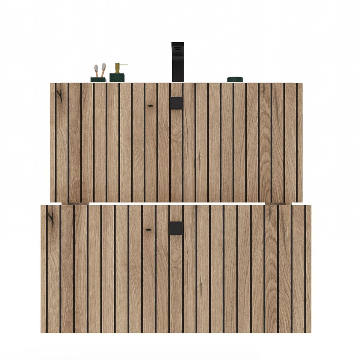 Hängender Badezimmerschrank mit gerillter Frontplatte und zwei Schubladen. .. mehr