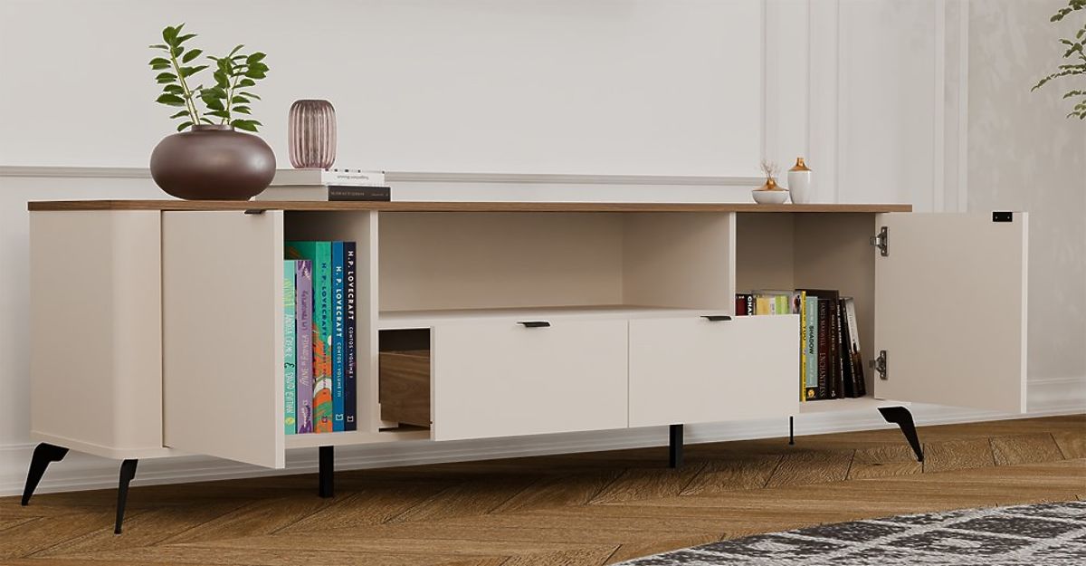 Der TV-Schrank CORDOBA 2D2S ist ein modernes Design aus der außergewöhnlichen Cordoba-Kollektion, die die Eleganz der beigen Kaschmirfarbe mit der Wärme der natürlichen Platte im Eiche-Castello-Dekor verbindet. Die minimalistische Form, abgerundete Seiten und markante Details machen dieses Möbelstück nicht nur funktional, sondern auch zu einem ästhetischen Element jedes Wohnzimmers.