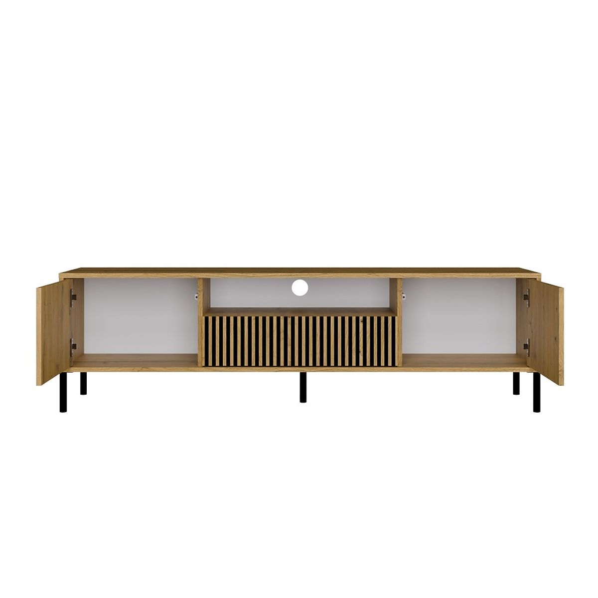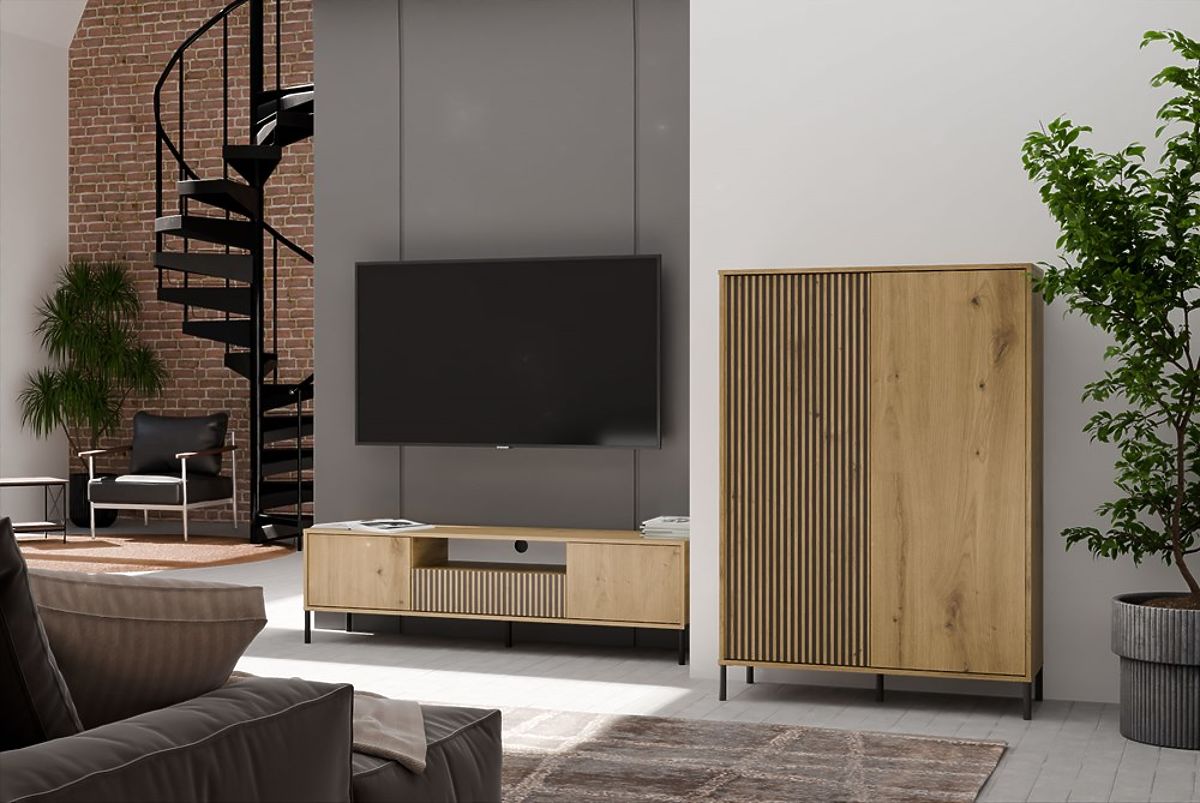 FARBE:Der RTV-Schrank KAMARO ist die ideale Lösung für alle, die modernen Stil und praktische Lösungen schätzen. Die minimalistische Konstruktion und die gerillten Frontplatten verleihen ihm einen außergewöhnlichen Charakter, während die durchdachte Anordnung von Regalen und Schränken eine bequeme Aufbewahrung und Organisation des Raumes ermöglicht.