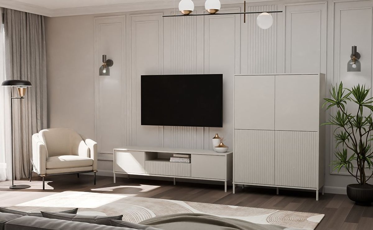 Moderner RTV-Schrank mit gerillten Fronten und praktischer Aufbewahrung. .. mehr