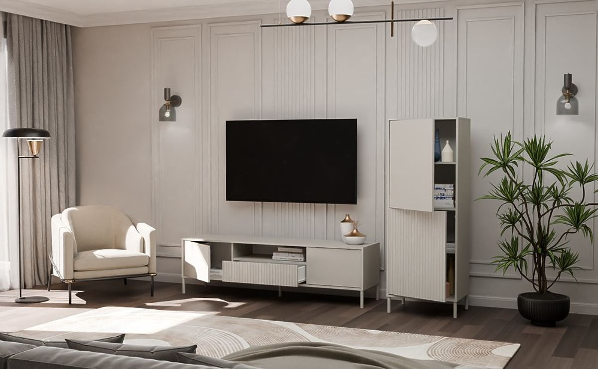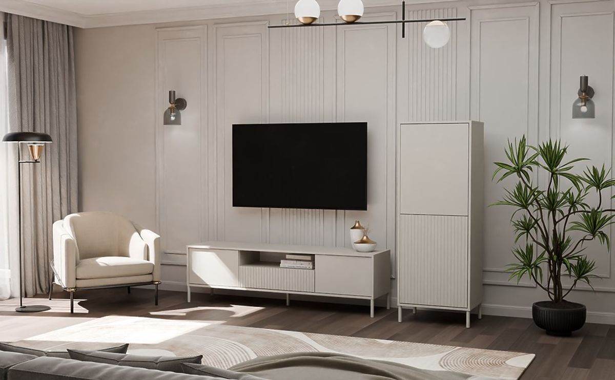 Luka-home.de » Möbel / Kommoden / Vitrine KAMARO 2DK SLIM/GLATT KASCHMIR Lamellenstruktur + Klassisches Frontpanel