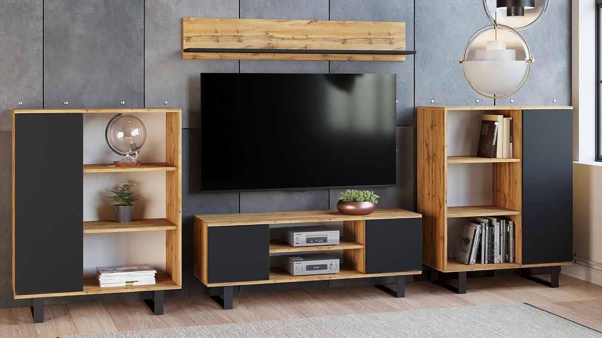 Der Schrank FONDI ist ein äußerst funktionales Möbelstück für Ihr Wohnzimmer, das Einfachheit mit einem auffälligen, vom Loft-Stil inspirierten Aussehen verbindet. Dank minimalistischer Formen und roher Materialien wie Metallelementen und Holz bringt der Schrank eine einzigartige Atmosphäre und Charakter in den Innenraum. Es ist die ideale Lösung für diejenigen, die Praktikabilität und modernes Design in einem schätzen. Der Schrank FONDI ist sowohl funktional als auch ästhetisch und bietet Platz zur Aufbewahrung und die Möglichkeit, Lieblingsdekorationen auszustellen.