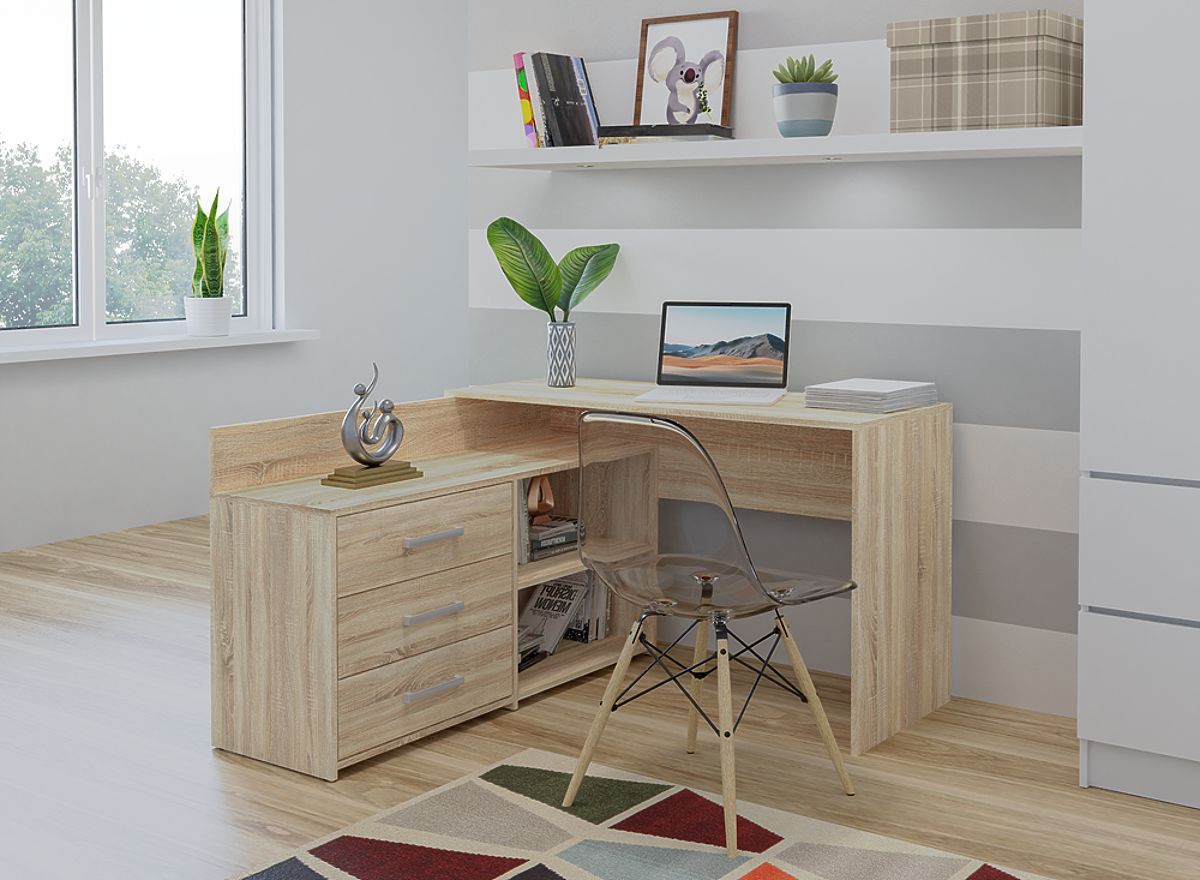 Der Eckschreibtisch mit 3 Schubladen ist eine funktionale Lösung für Personen, die viel Platz zum Arbeiten und eine bequeme Anordnung der wichtigsten Arbeitswerkzeuge benötigen.