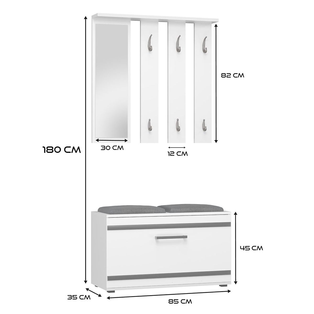 Flurschrank mit Spiegel und Schuhschrank in Weiß. .. mehr