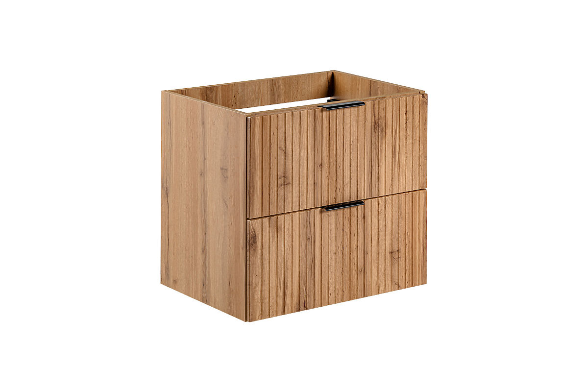 Der Waschtischunterschrank 60 cm mit zwei Schubladen aus der Adel Oak Kollektion vereint Eleganz mit Funktionalität. Er zeichnet sich durch klassische Proportionen und einzigartige gerillte Fronten aus. Die Griffe in drei Farben - Goldglanz, Chromglanz und Schwarz matt - verleihen ihm ein stilvolles Aussehen.