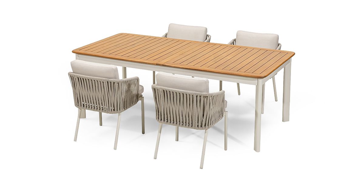 Das Gartenset Porticato ist die Quintessenz modernen Designs und Komforts. Es besteht aus einem ausziehbaren Tisch und vier stilvollen Stühlen, die zusammen einen funktionalen und ästhetischen Raum für Erholung im Freien schaffen. Die hellbeige Farbgebung, die Kombination aus Holz und Metall sowie sorgfältig ausgewählte Details sorgen dafür, dass das Set sowohl mit dem Grün des Gartens als auch mit einer modernen Terrasse perfekt harmoniert. Sowohl der Tisch als auch die Stühle Porticato haben eine leichte, aber dennoch stabile Konstruktion aus hellbeige pulverbeschichtetem Aluminium. Diese Lösung garantiert Korrosions- und mechanische Beständigkeit. Die ausziehbare Tischplatte, aus langlebigem Akazienholz mit Teak-Finish, ermöglicht es, die Länge je nach Anzahl der Gäste und Anlass anzupassen. Ein weiterer Vorteil ist das FSC®-Zertifikat, das die Herkunft des Holzes aus verantwortungsvoll bewirtschafteten Quellen bestätigt. Die Stühle bestechen durch außergewöhnlichen Komfort – dank der geflochtenen Rückenlehnen aus langlebigem Seil und weichen Kissen aus hydrophobem Stoff. Es ist der perfekte Ort, um mit einer Tasse Kaffee, einem Buch oder bei langen Gesprächen mit Freunden zu entspannen. Möbel aus Naturholz bewahren ihre charakteristischen Eigenschaften, daher werden alle Unebenheiten, Kratzer, Risse, Knoten, Spalten, Löcher, Vertiefungen, unebene Kanten, unterschiedliche Maserungen, Farbunterschiede und andere Unregelmäßigkeiten in der Struktur während des Herstellungsprozesses bewusst beibehalten. Diese Eigenschaften unterstreichen die Authentizität des Materials und verleihen jedem unserer Produkte einen einzigartigen Charakter, was zu Unterschieden im Aussehen im Vergleich zu den präsentierten Fotos führen kann. Um das Set in einwandfreiem Zustand zu halten, wird empfohlen, es in der Wintersaison an einem trockenen und belüfteten Ort unter einem Unterstand zu lagern, um es vor Witterungseinflüssen zu schützen.
