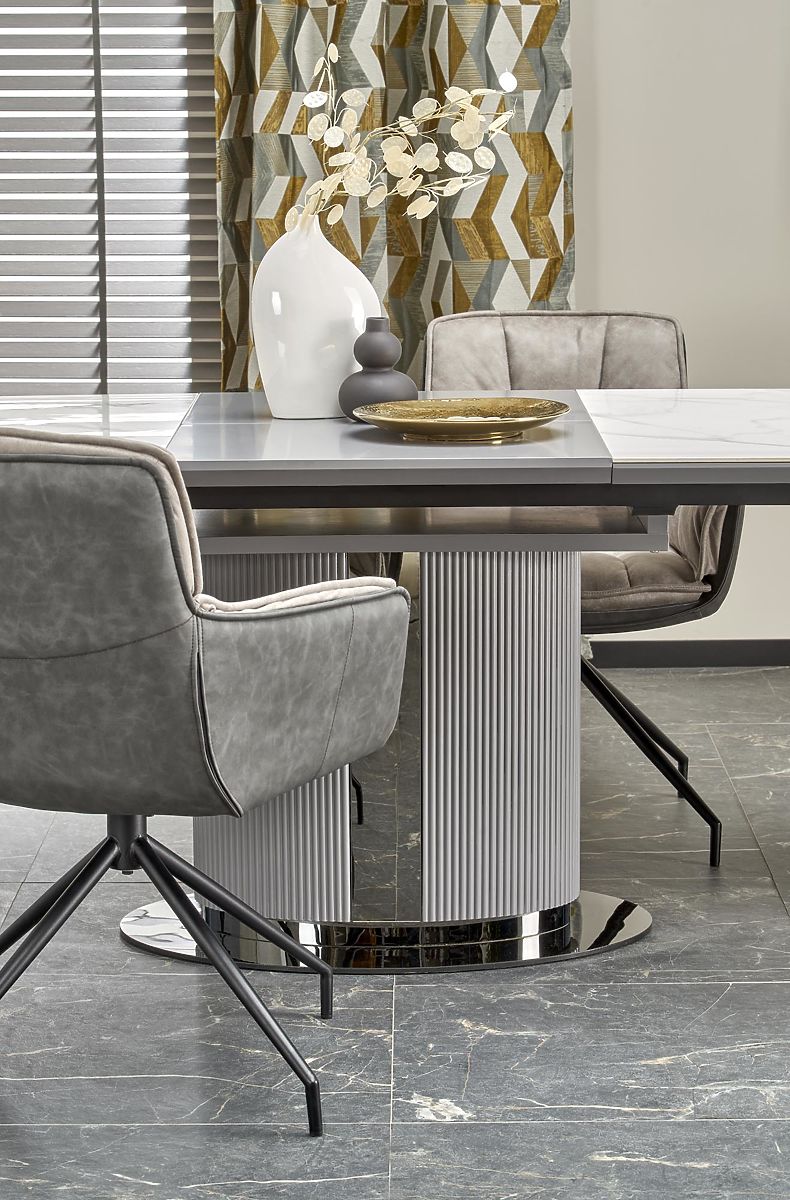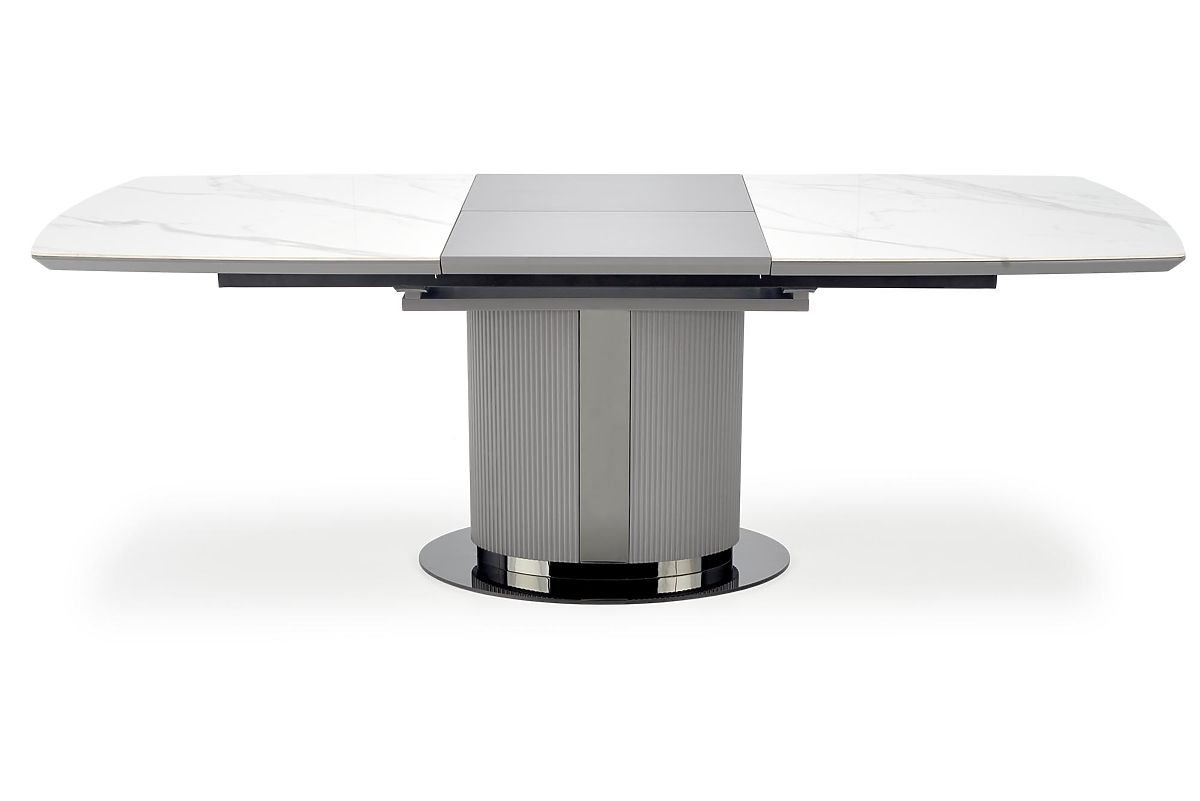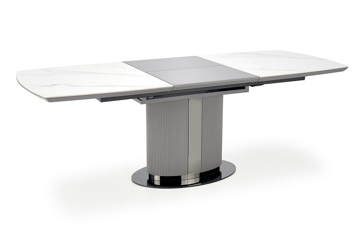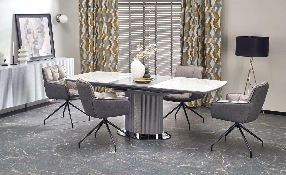 Ausziehbarer Tisch mit weißem Marmor und grauen Akzenten. .. mehr