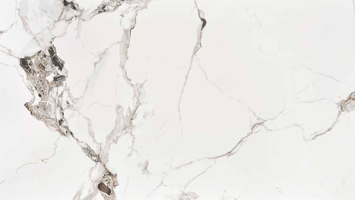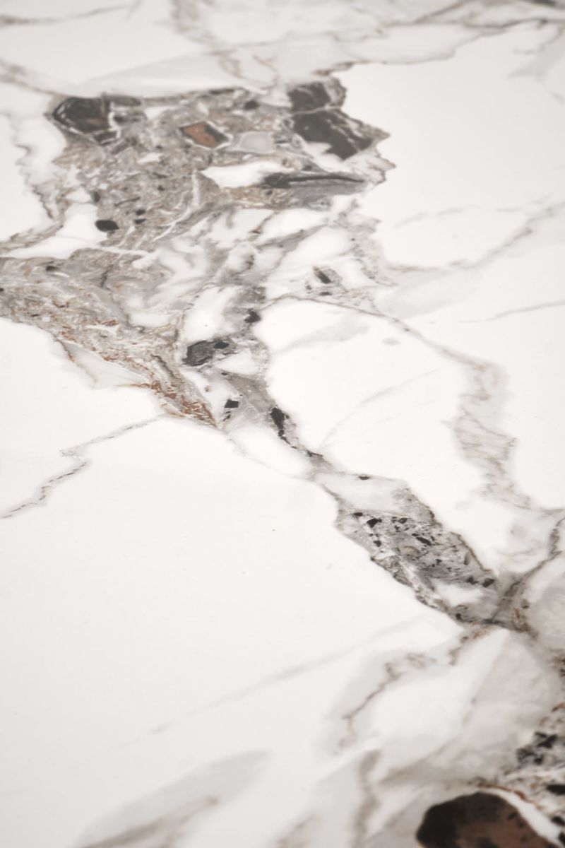 Tisch mit weißer Marmorplatte und schwarzen Beinen. .. mehr