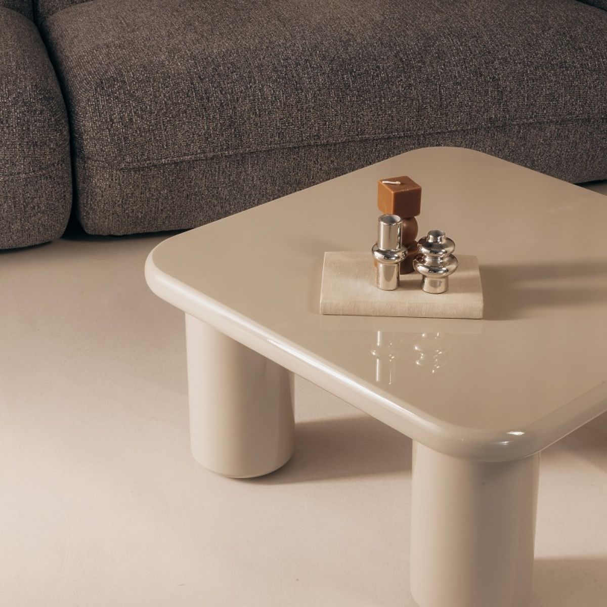 Dunkelbeiger Couchtisch mit glänzender Oberfläche und abgerundeten Kanten. .. mehr